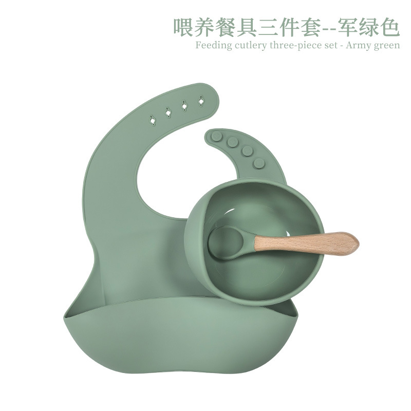 army green -- bib bowl wooden spoon three-piece set