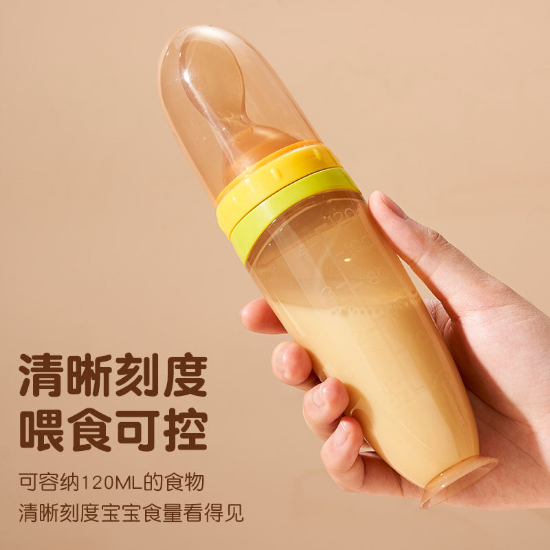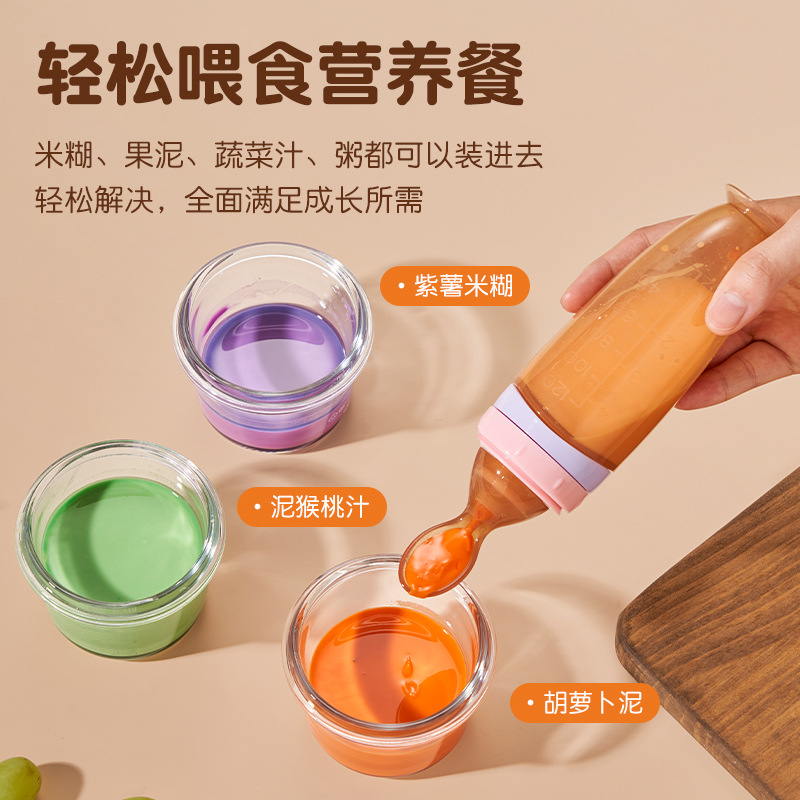 Material: The bottle body is made of silicone, and the spoon head is made of PP material (the new soft-headed rice porridge spoon has a silicone spoon head).
