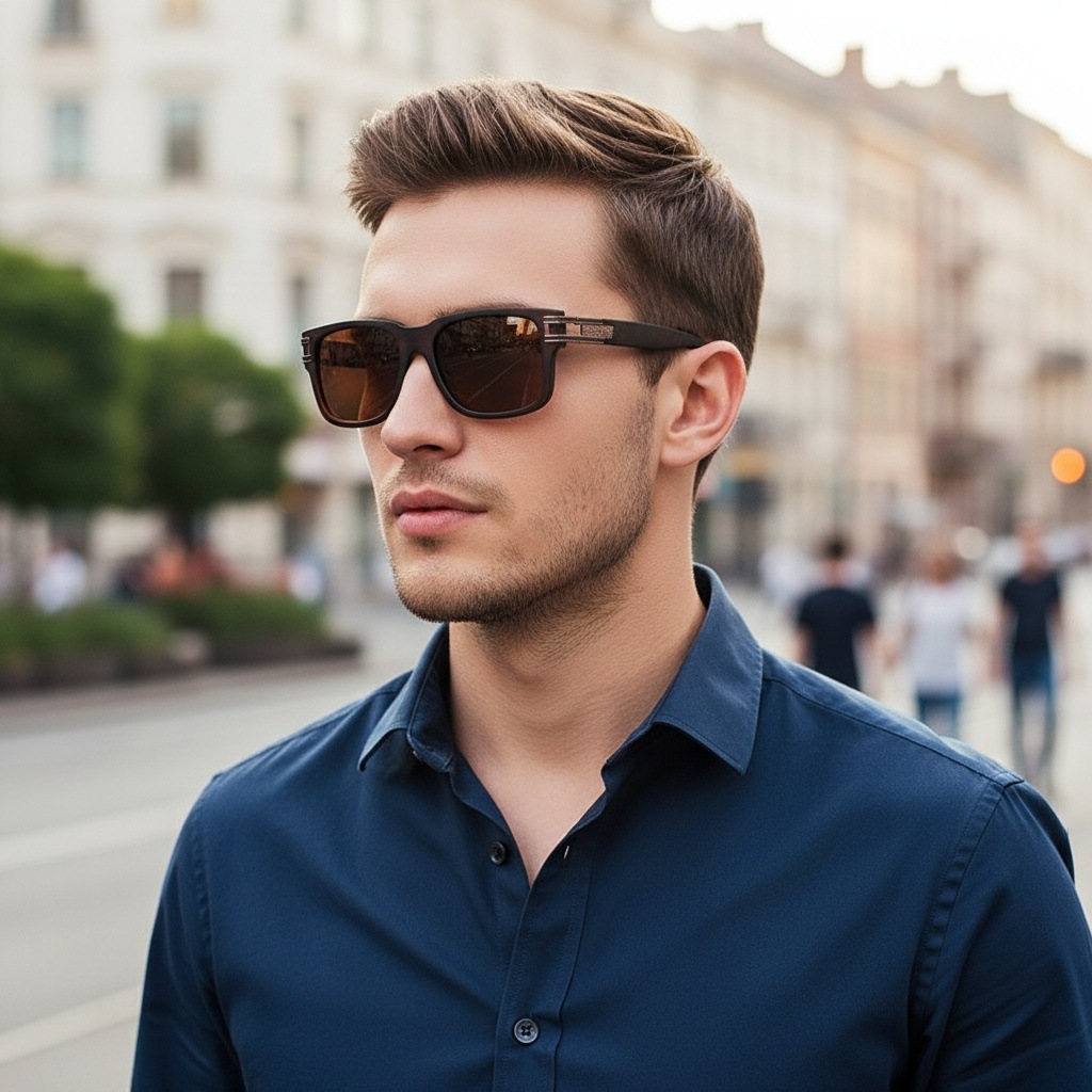 muted blue frame, gray lenses