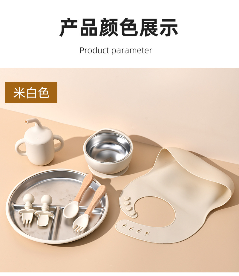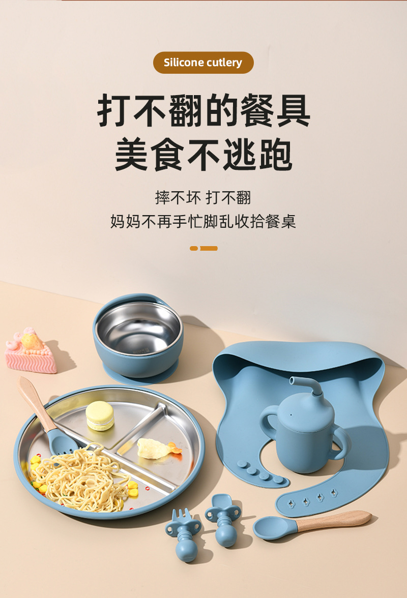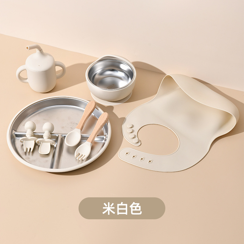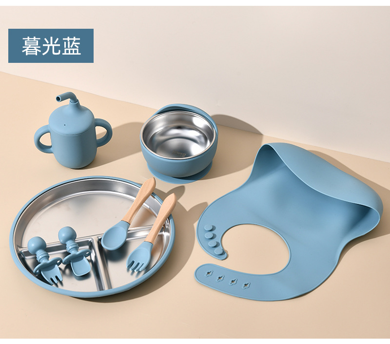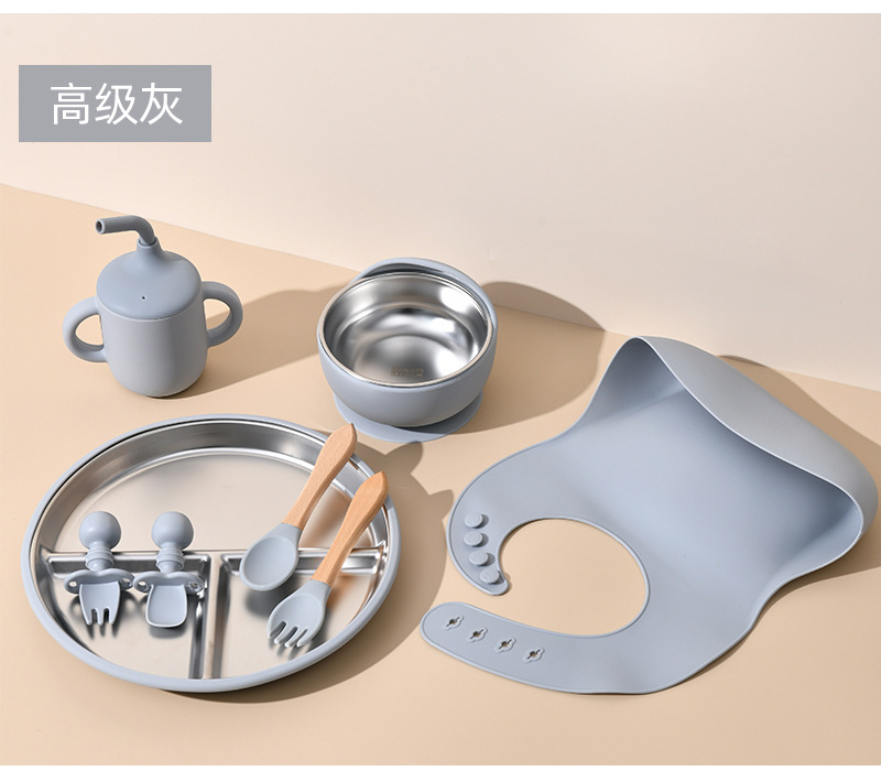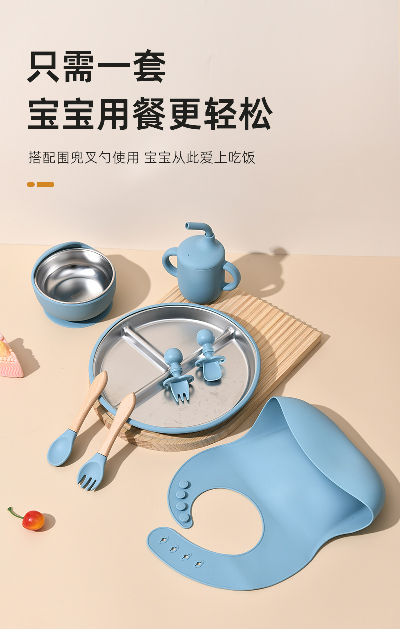 Accessories: 1 divider plate, 1 snail bowl with stainless steel inner, 1 bib, 1 long-handle spoon, 1 fork, 1 short-handle fork, 1 spoon, 1 straw cup; Total: 8 pieces set.