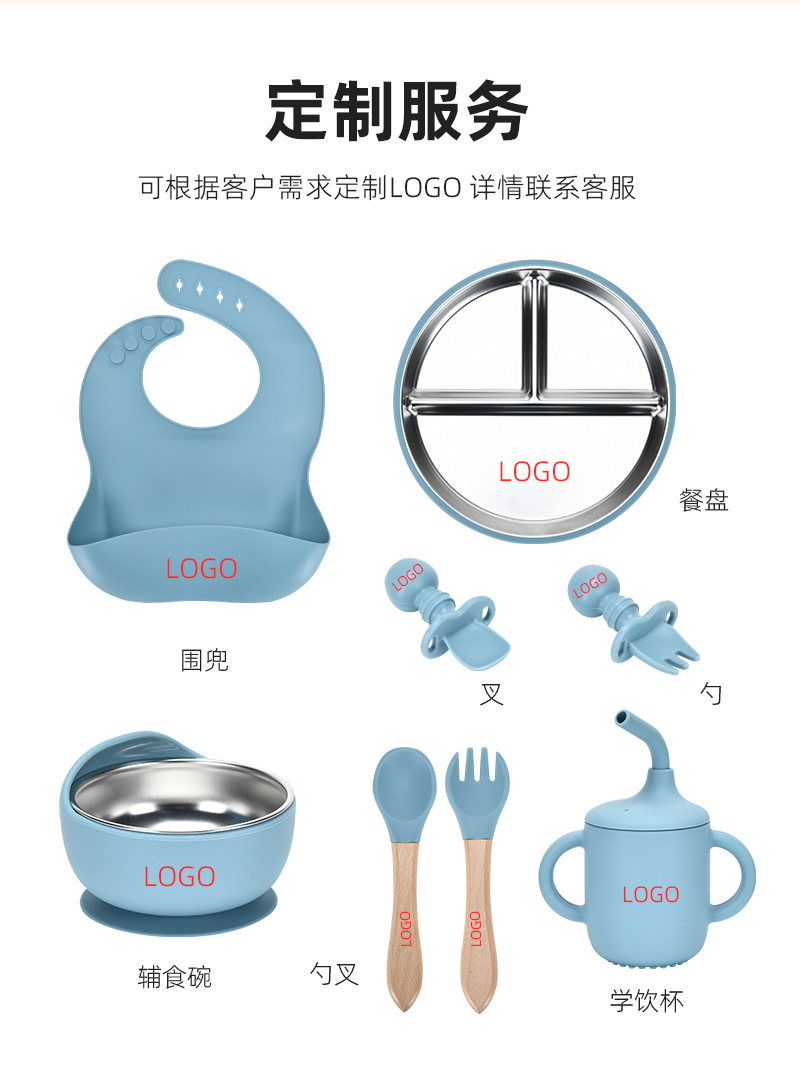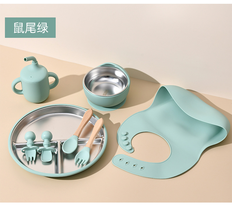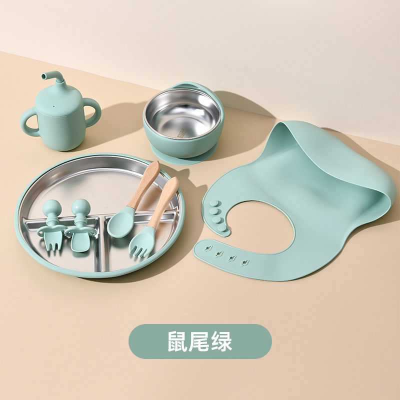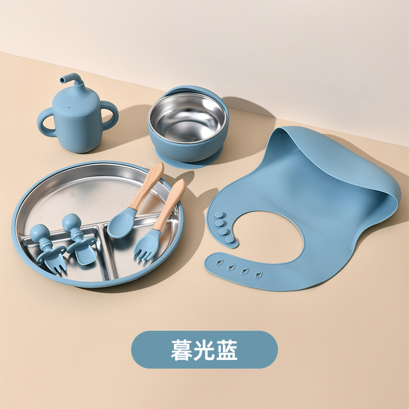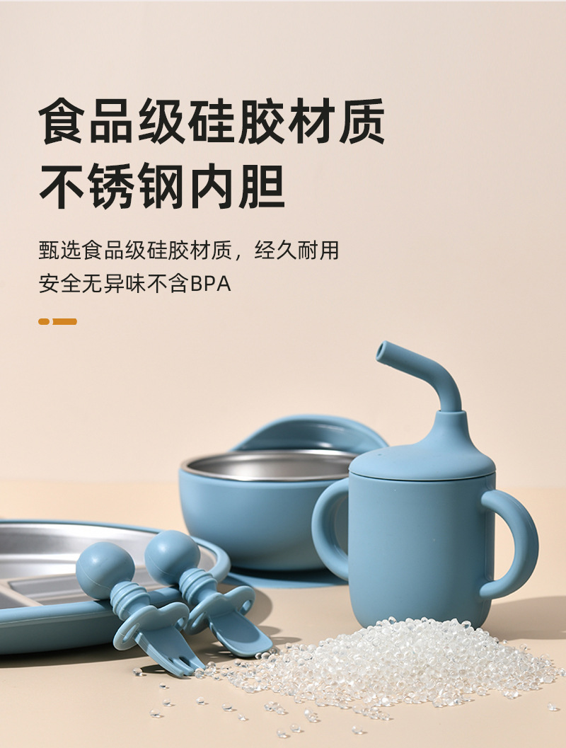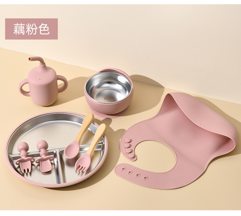 Accessories: 1 divider plate, 1 snail bowl with stainless steel inner, 1 bib, 1 long-handle spoon, 1 fork, 1 short-handle fork, 1 spoon, 1 straw cup; Total: 8 pieces set.