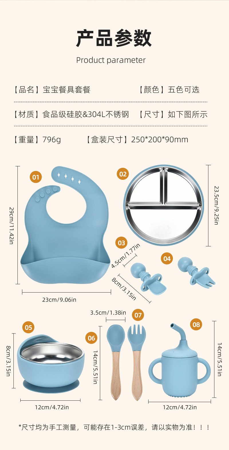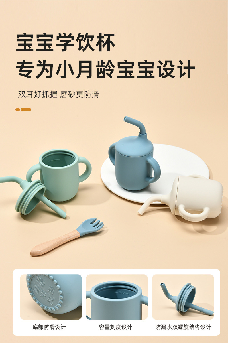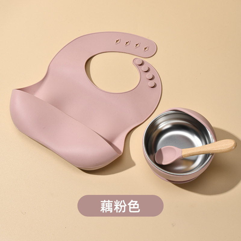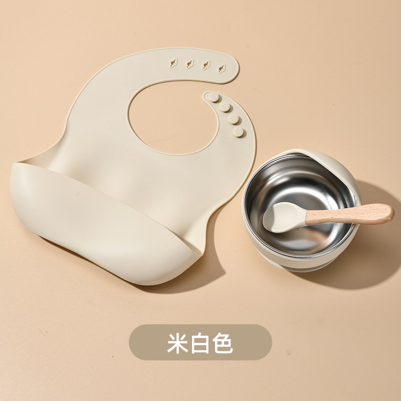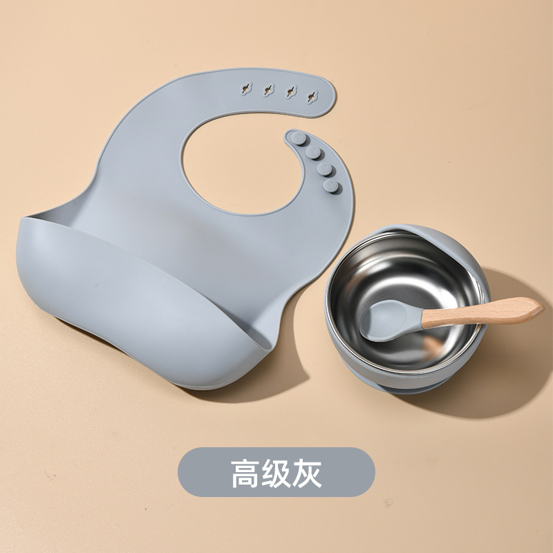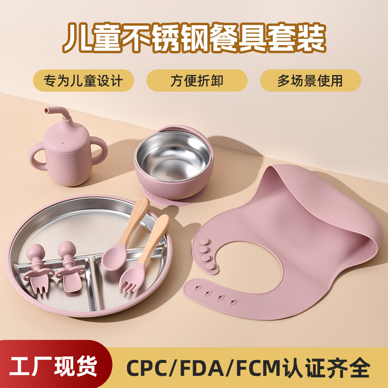 Accessories: 1 divider plate, 1 snail bowl with stainless steel inner, 1 bib, 1 long-handle spoon, 1 fork, 1 short-handle fork, 1 spoon, 1 straw cup; Total: 8 pieces set.