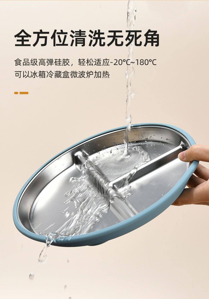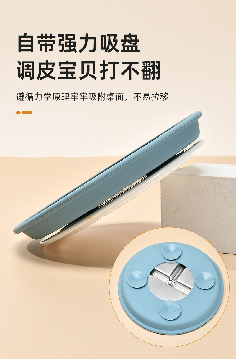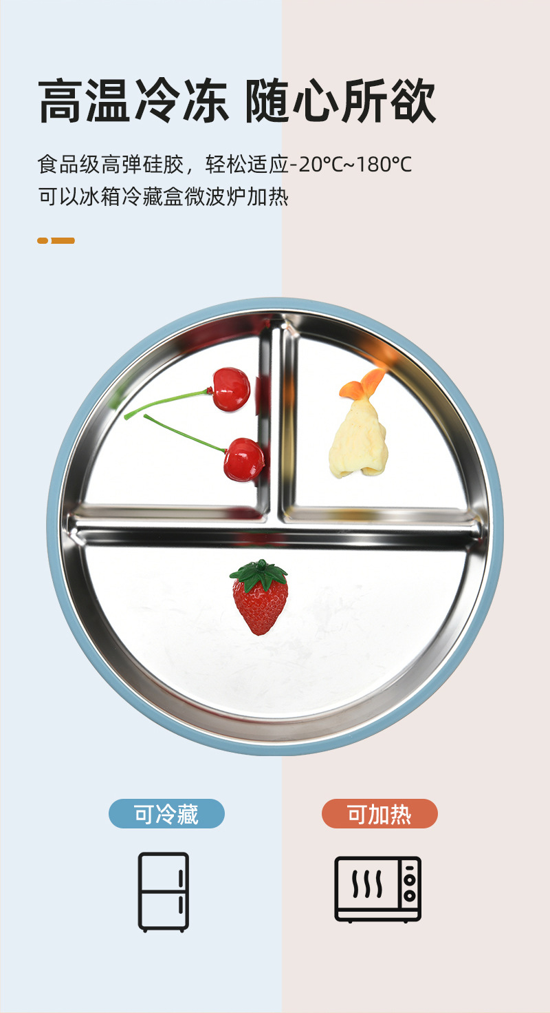 Function: The 304 stainless steel dinner plate is equipped with a silicone suction cup cover, which not only prevents spills but also insulates heat. It can be microwave-safe and refrigerated, meeting the needs of different usage scenarios. The fresh and simple color combination is deeply favored by consumers!