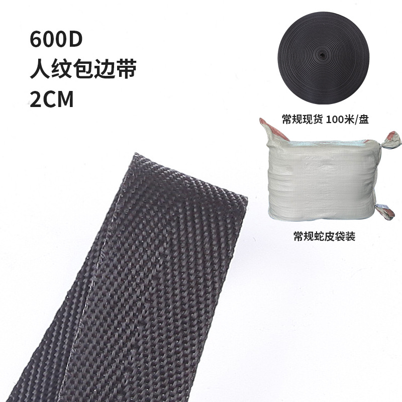 black 2cm 600d twill boud edage belt. order in multiples of 100 meters.