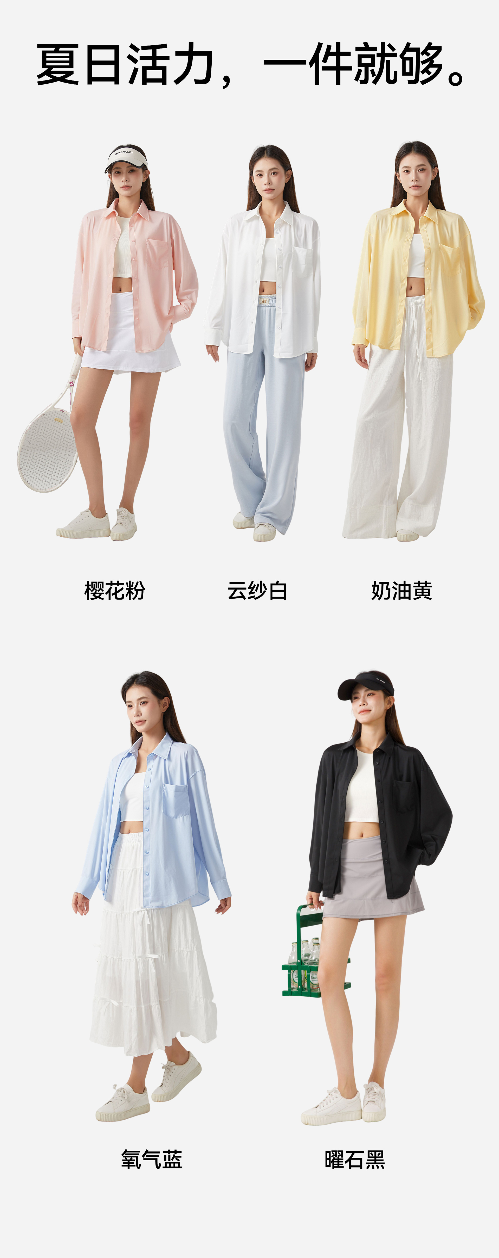 cream yellow, cherry blossom powder, oxygen blue, cloud yarn white, obsidian black