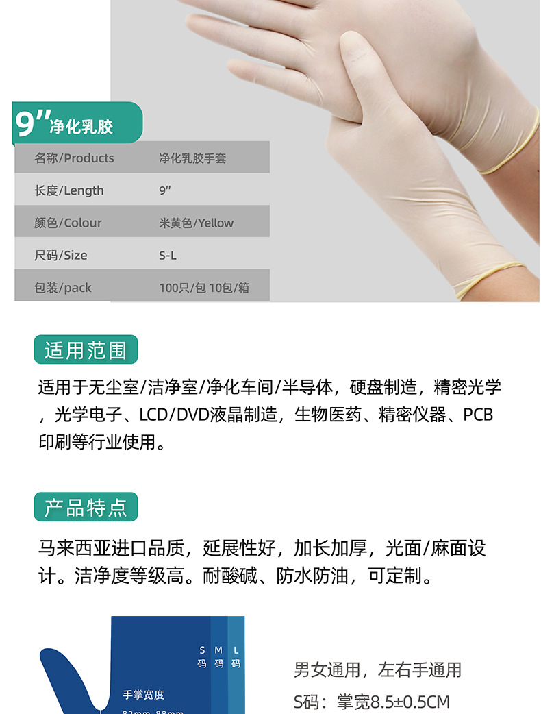 s * 9-inch hemp surface powder-free latex gloves