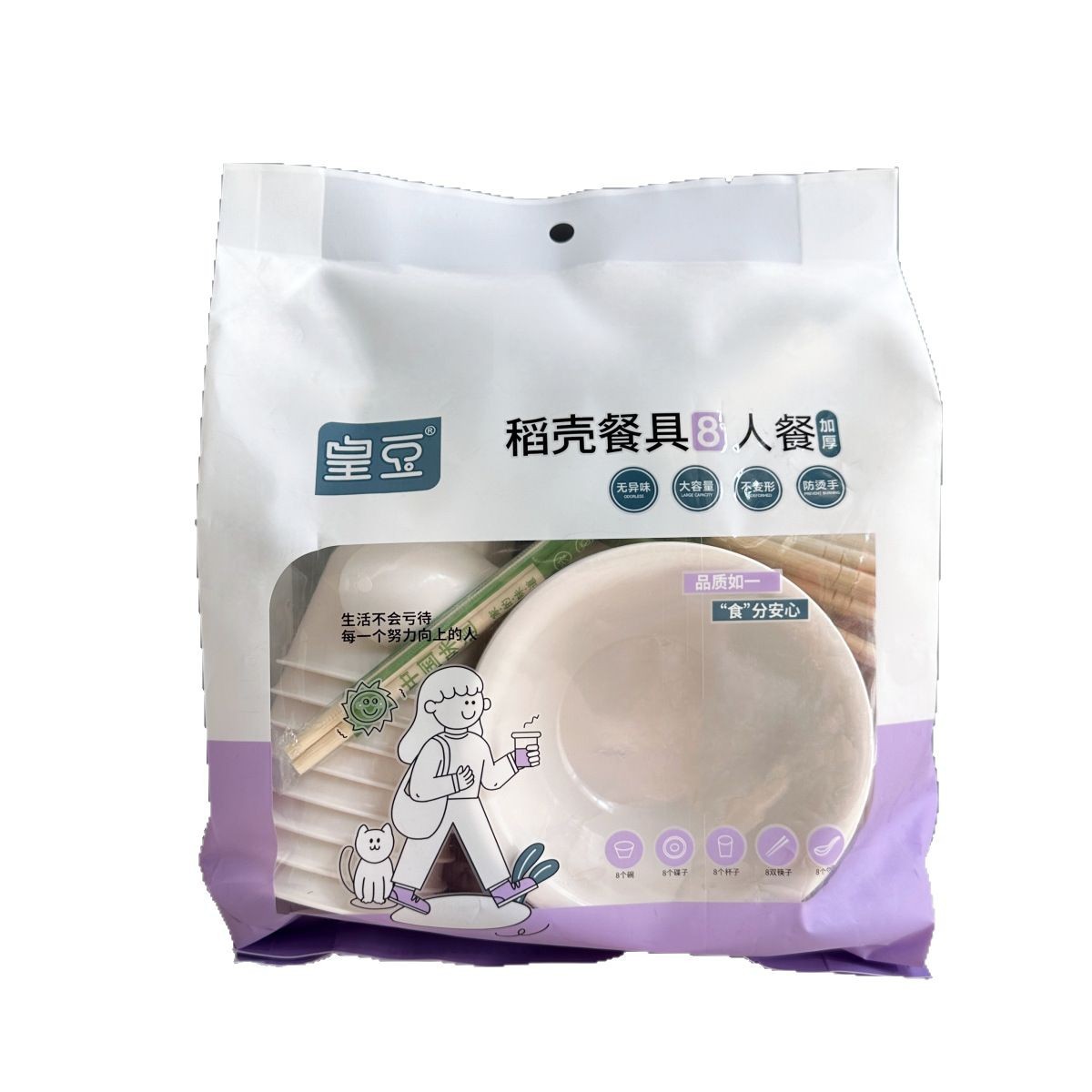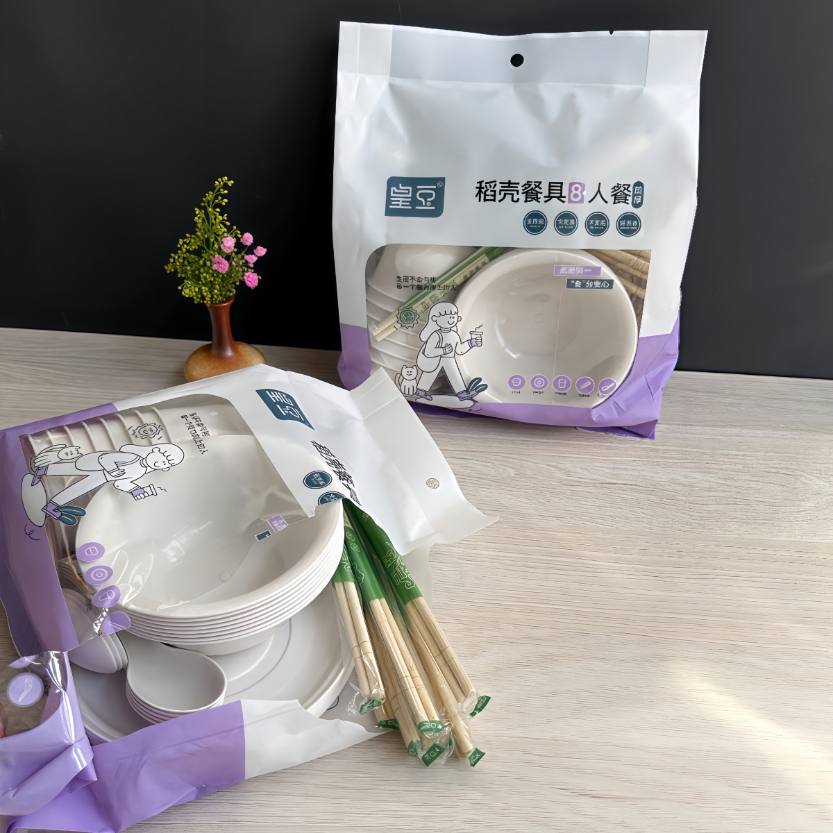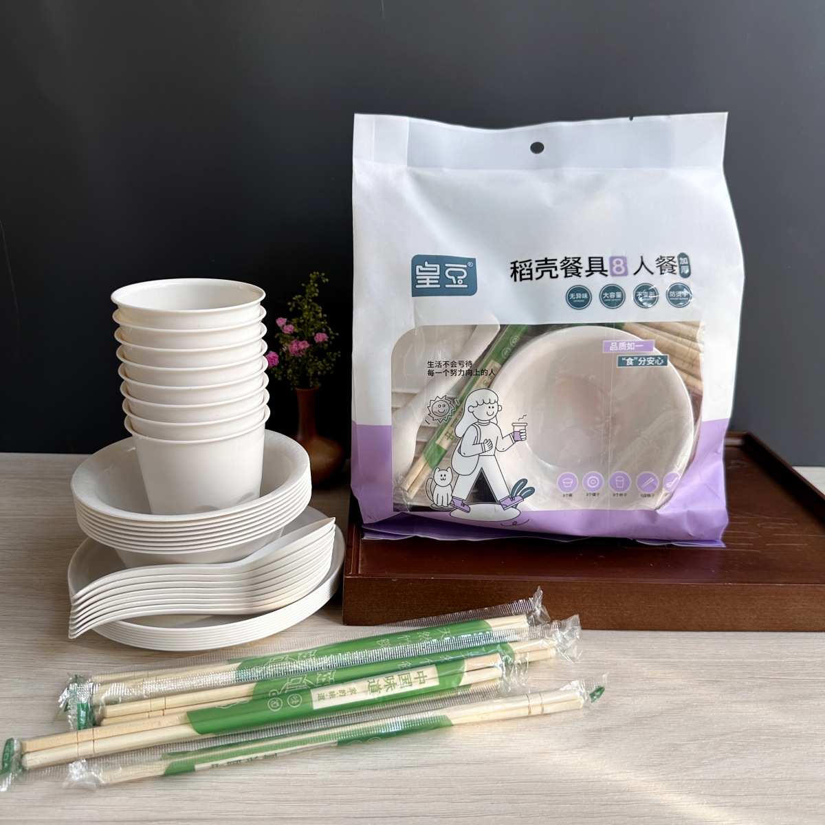 1 pack of 8 people set (chopsticks + cup + bowl + spoon + dish)
