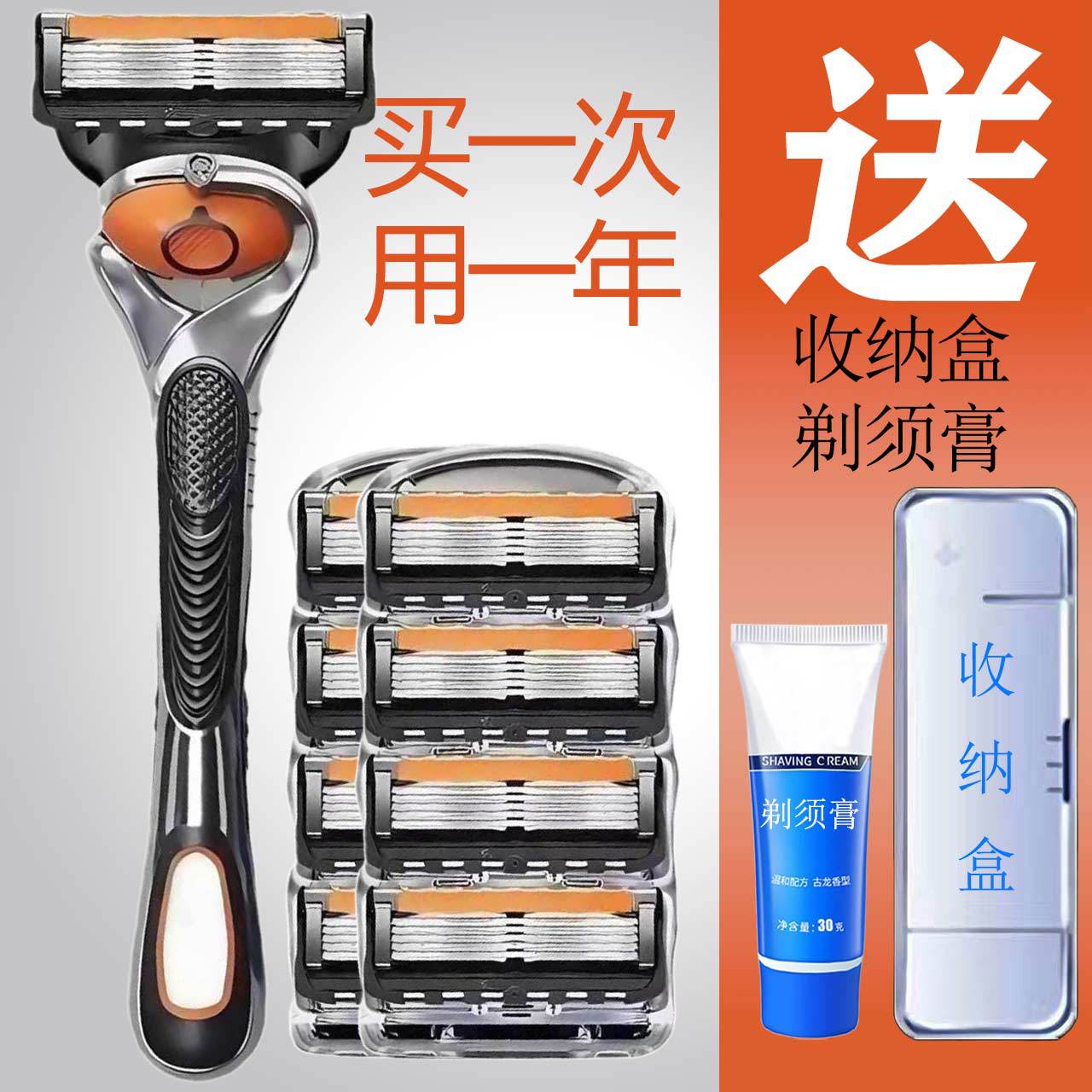 1 razor holder +8 razor heads + shaving cream + storage box [the default color of the razor head is orange and black. if you need other colors, please contact customer service]