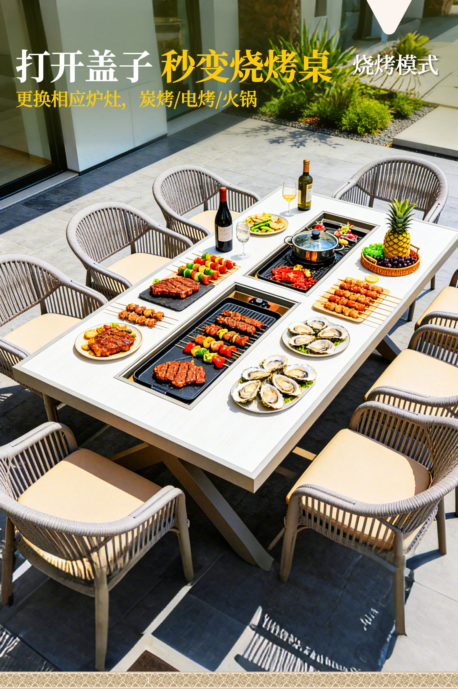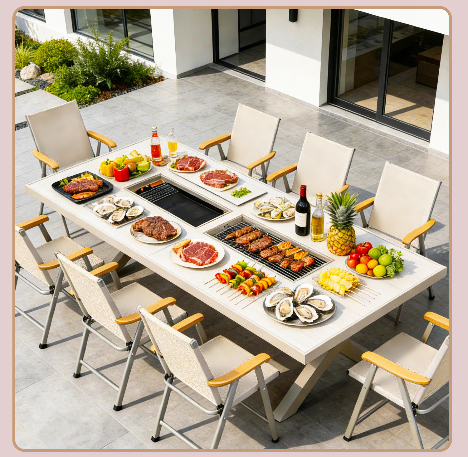230*100 aluminum plate single furnace barbecue table +8 folding textilene chairs [choose 1 from 3-electric or charcoal]