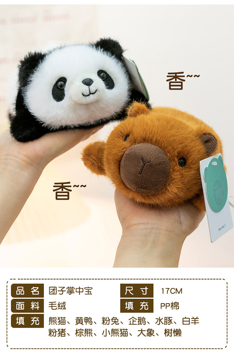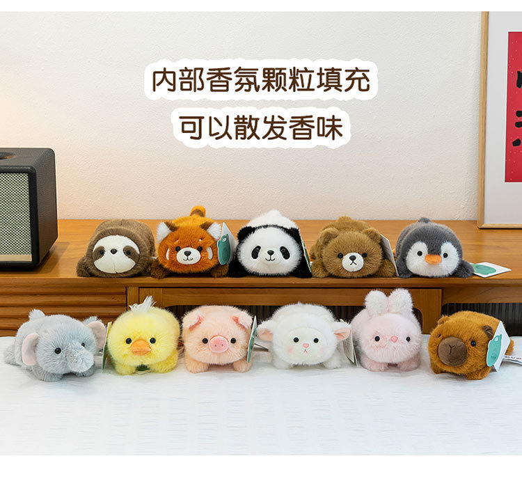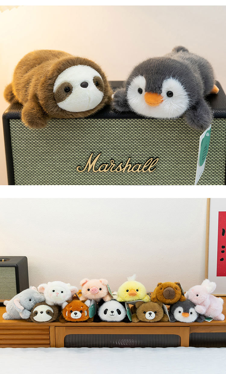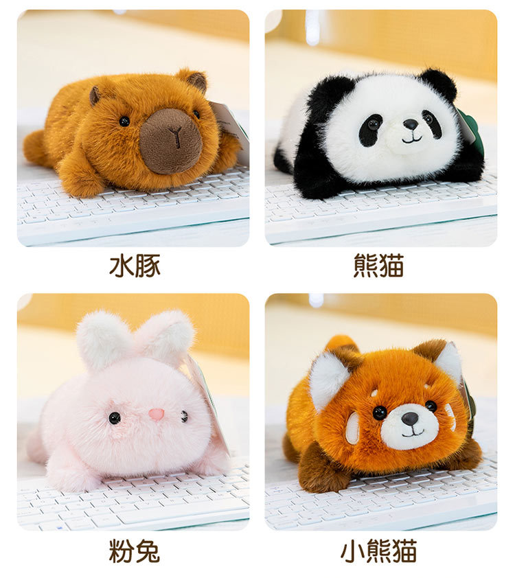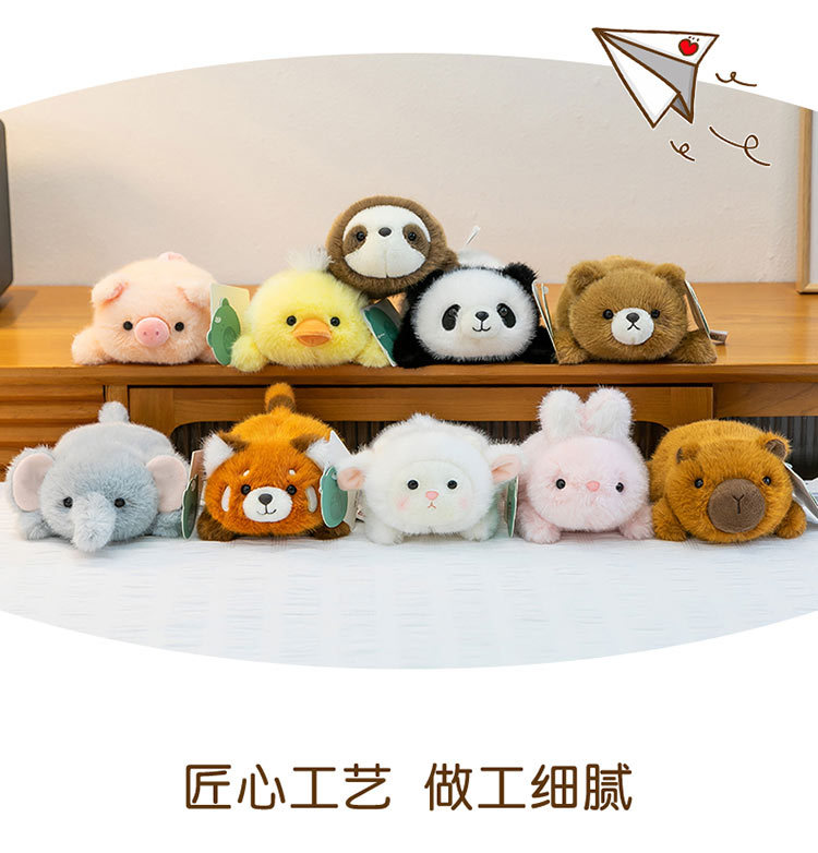 color: panda, yellow duck, pink rabbit, penguin, capybara, white sheep, pink pig