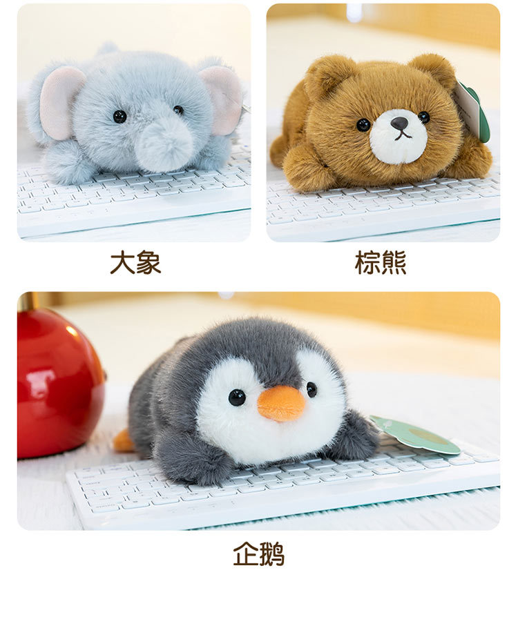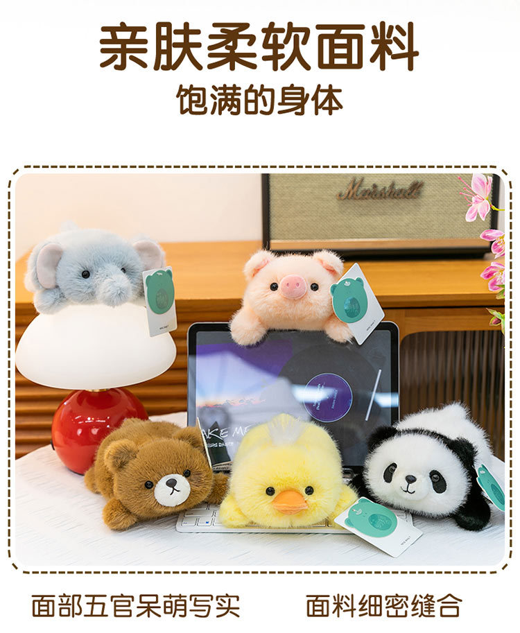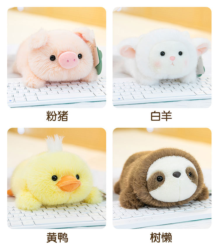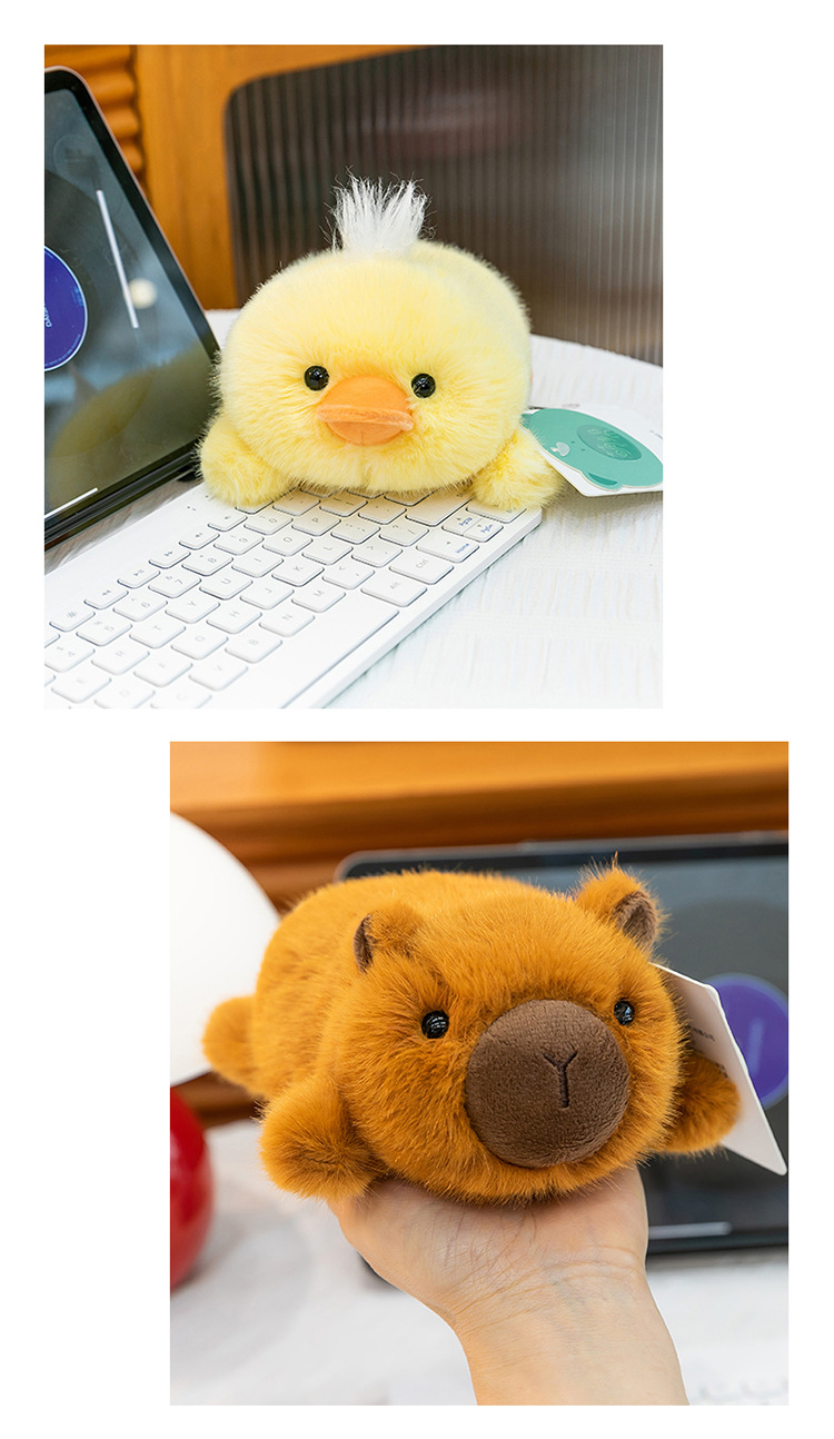 color: panda, yellow duck, pink rabbit, penguin, capybara, white sheep, pink pig