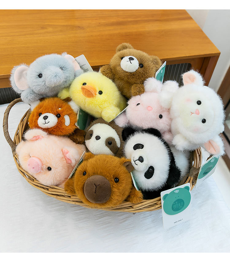 panda, yellow duck, pink rabbit, penguin, capybara, white sheep, pink pig