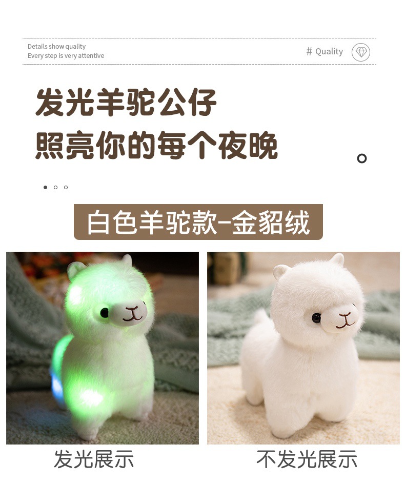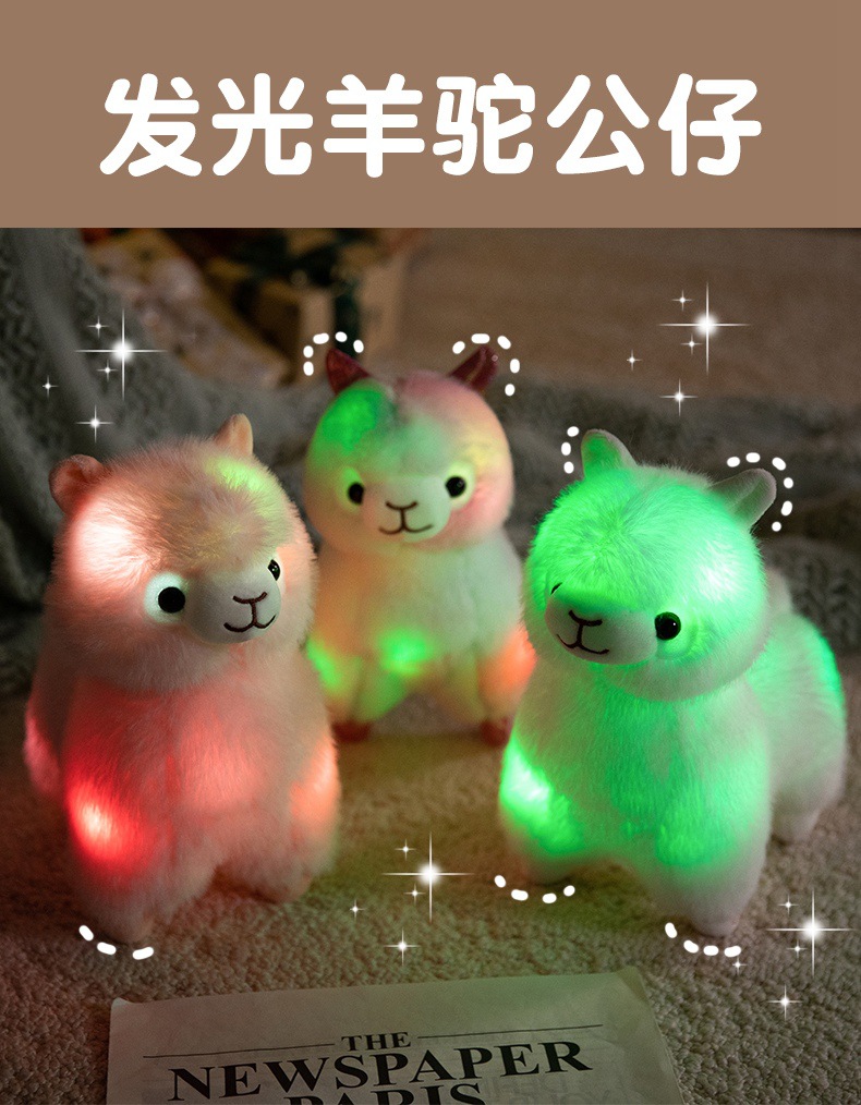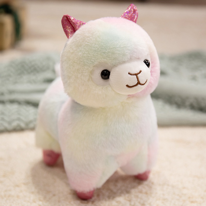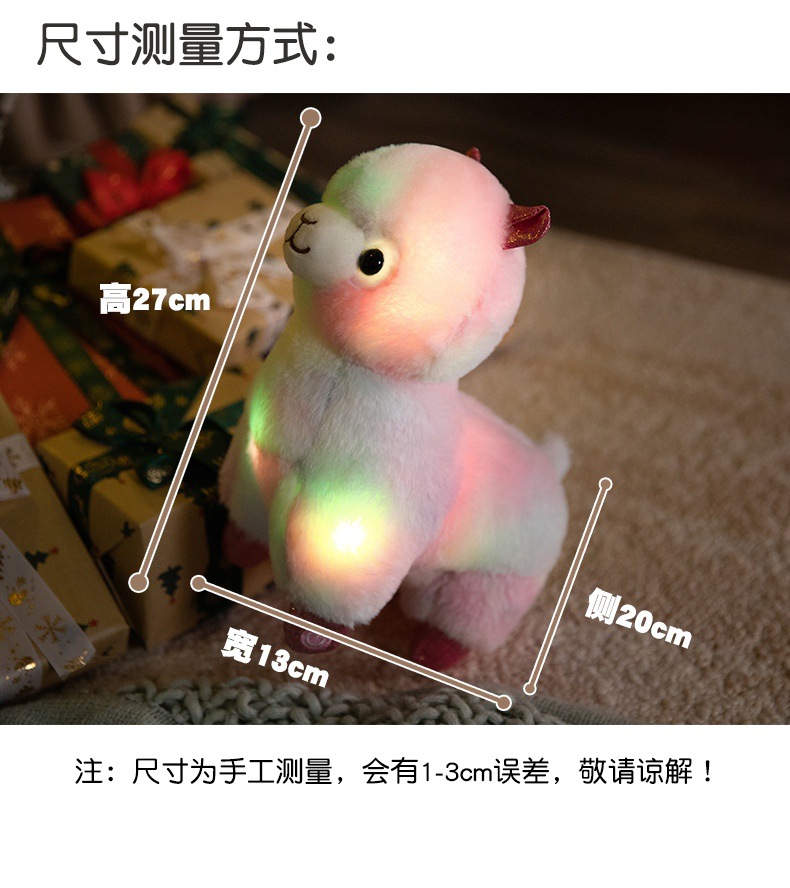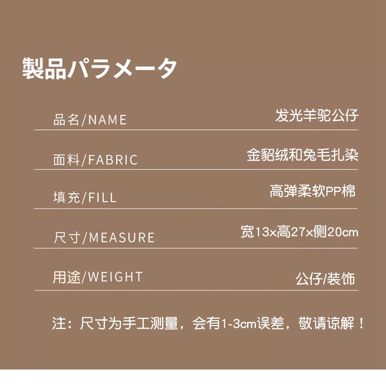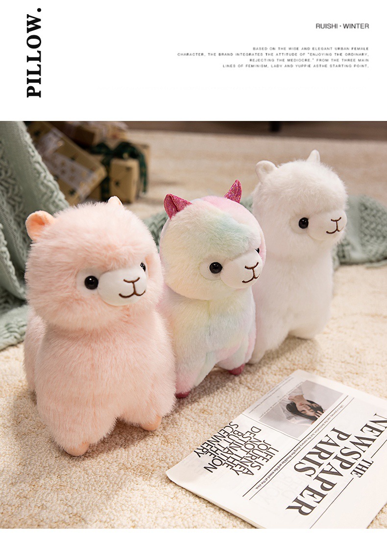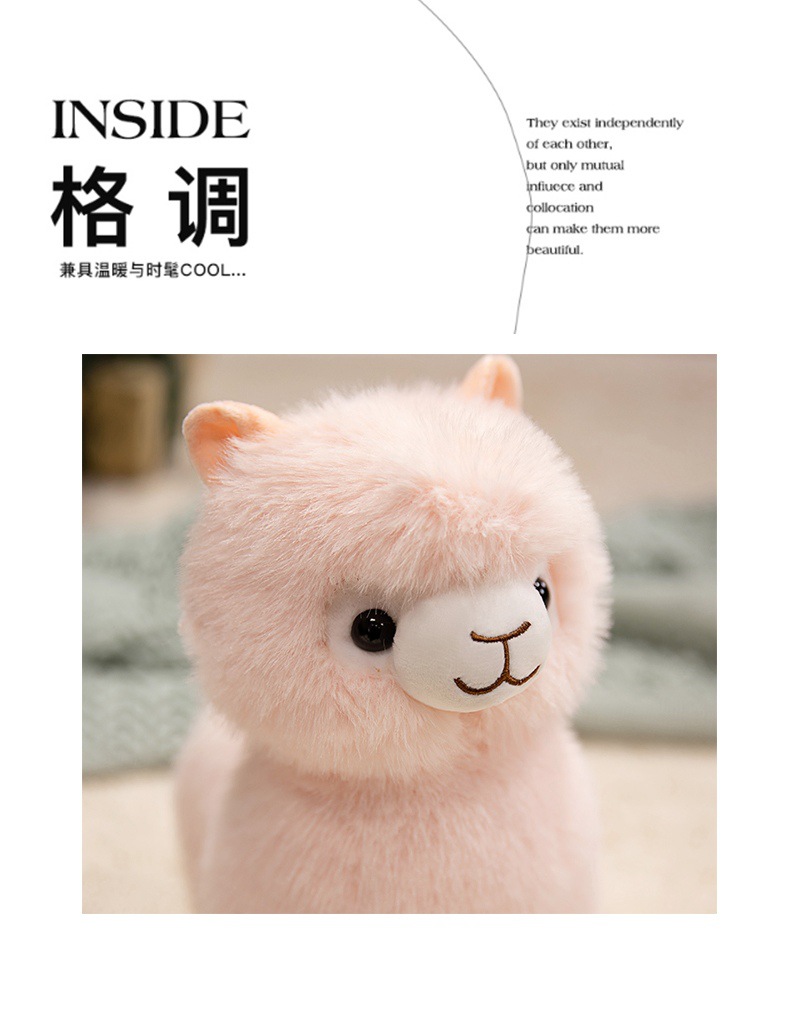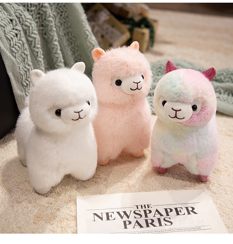 Standing alpaca size about 27cm high, 20cm long, 13cm wide. Weight about 0.28kg.