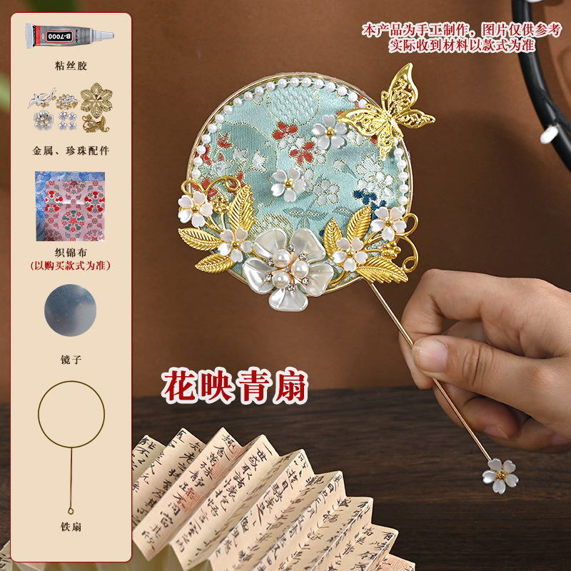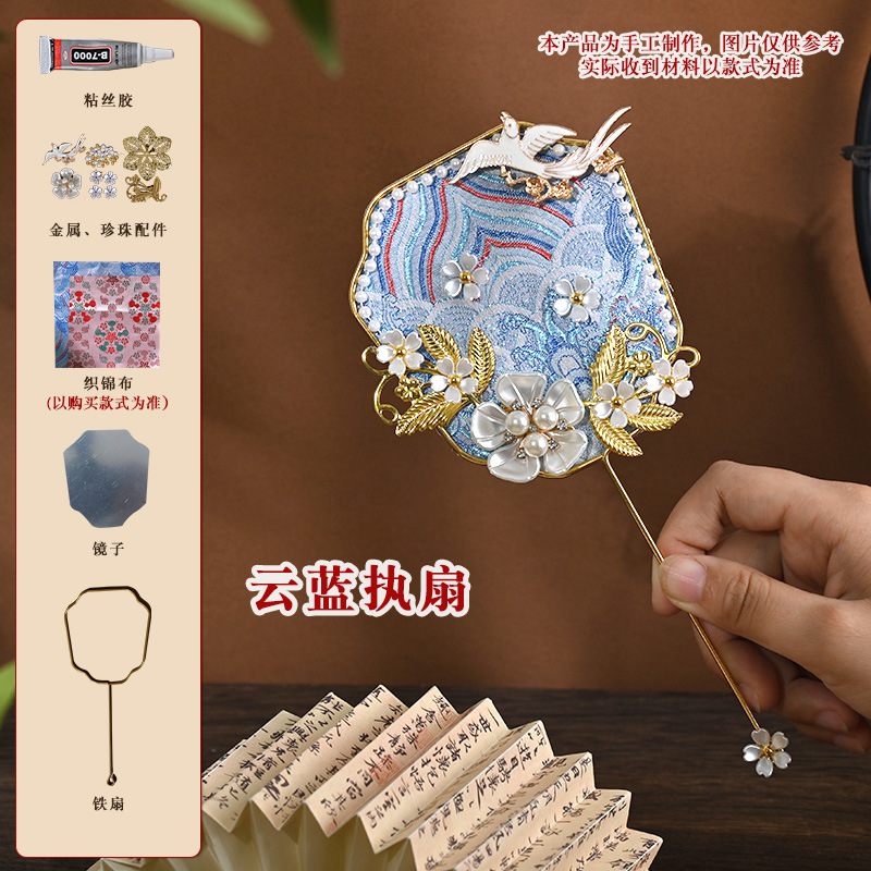 brocade national style small circular fan suit-blue brocade flower exploration