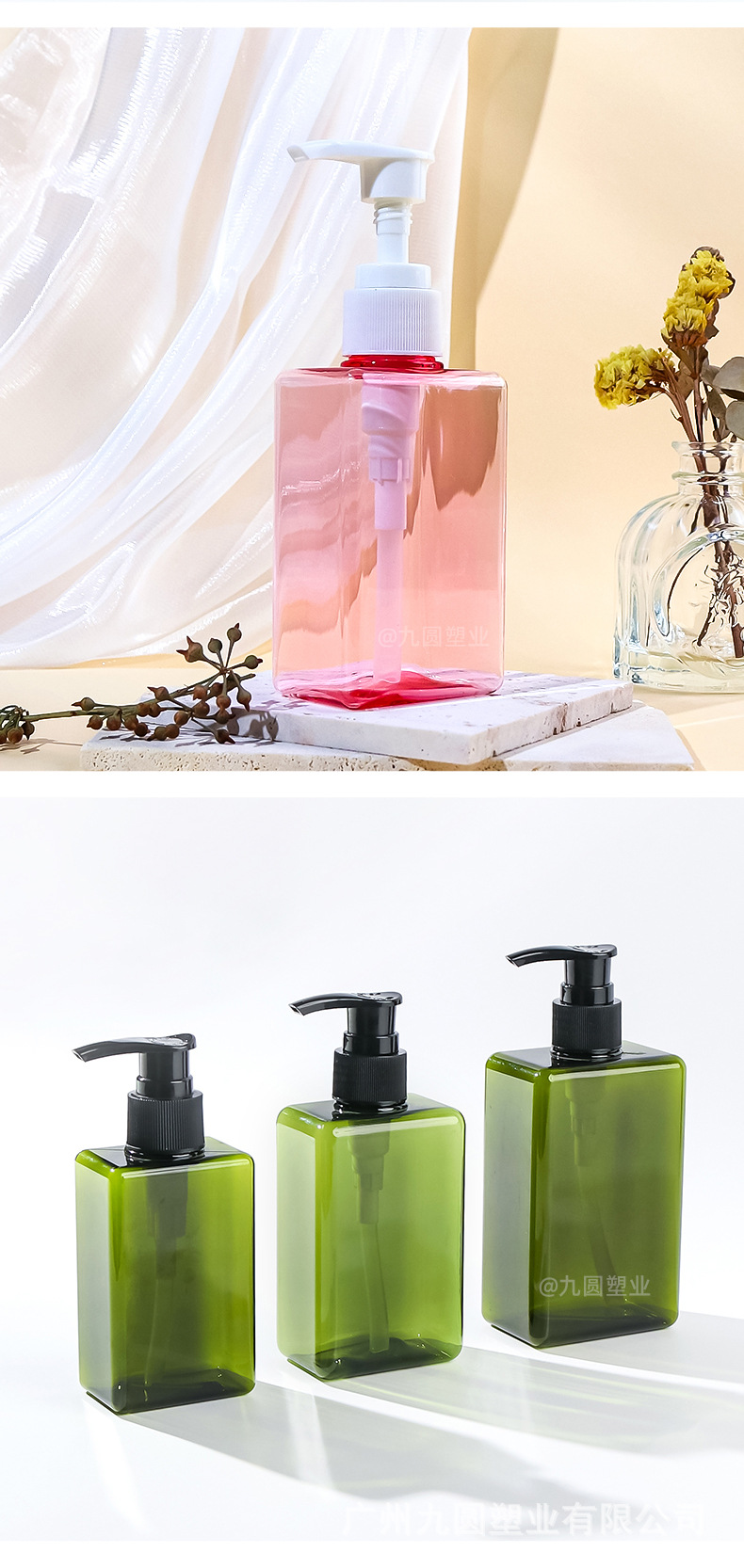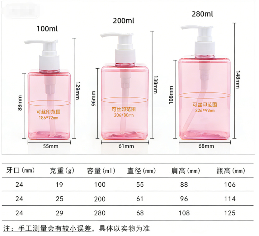 280ml; transparent pink bottle + white pump head; pet