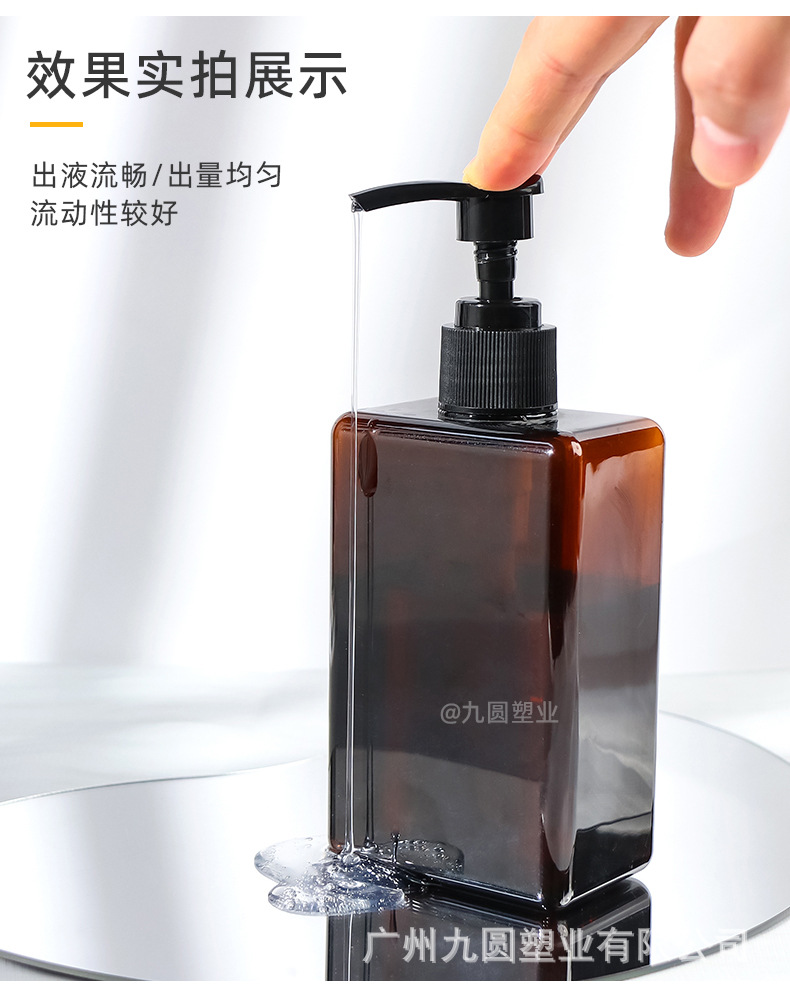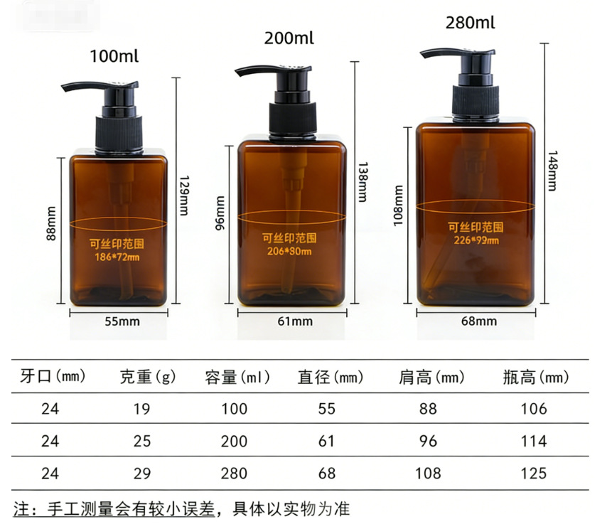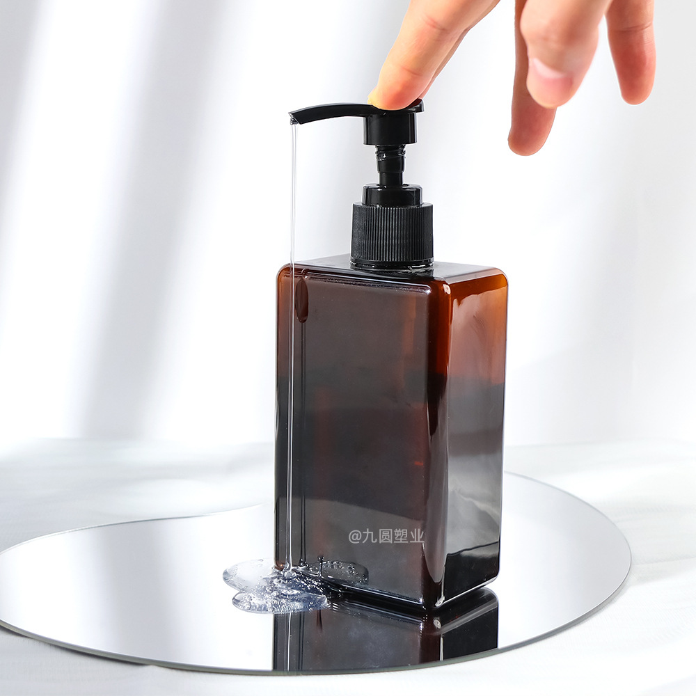 280 ml; amber bottle with black pump; pet