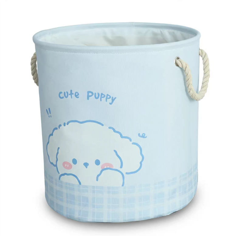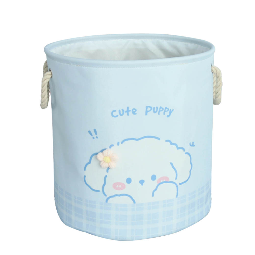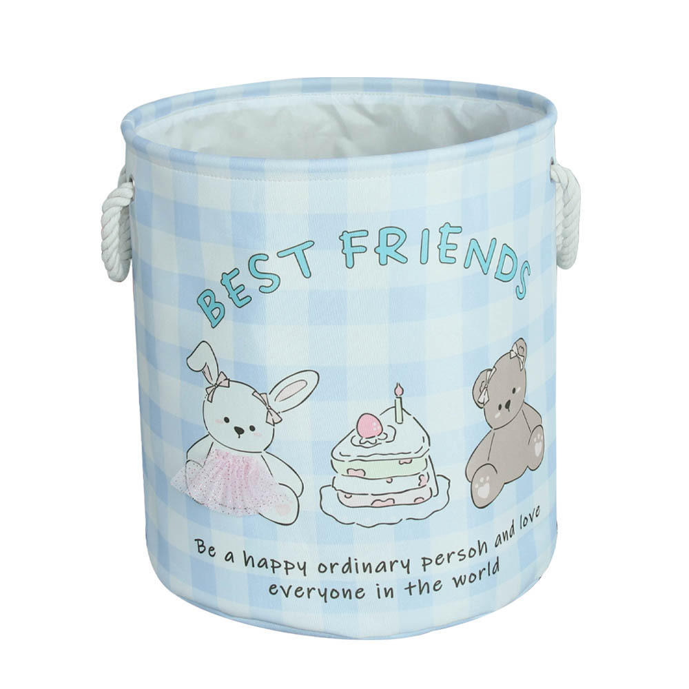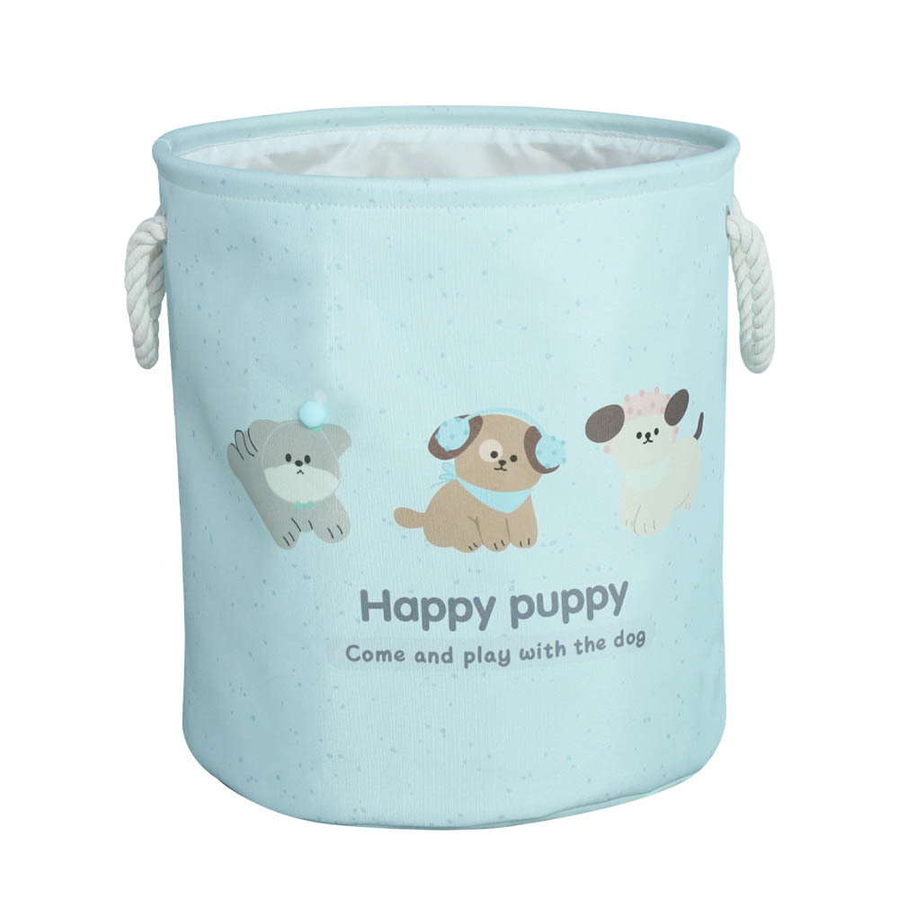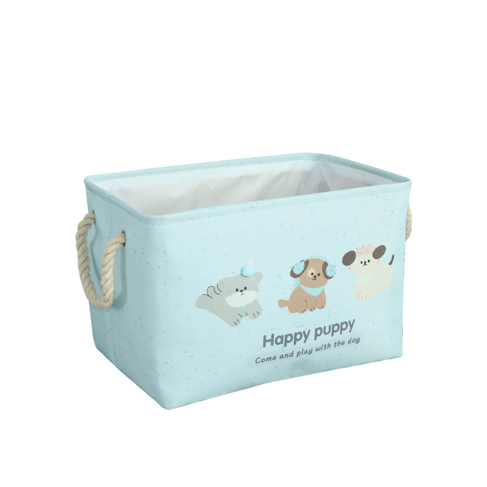 color: blue puppy storage bucket, pink bunny storage bucket, birthday muppet