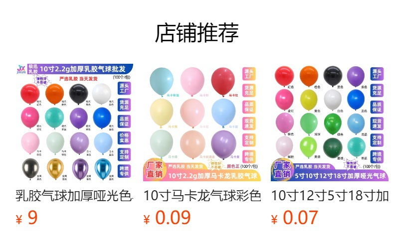 Matte latex balloons in sizes 5 inches, 10 inches, and 12 inches are sold in packs of 100 by default, with OPP packaging. For other packaging options, please contact customer service.