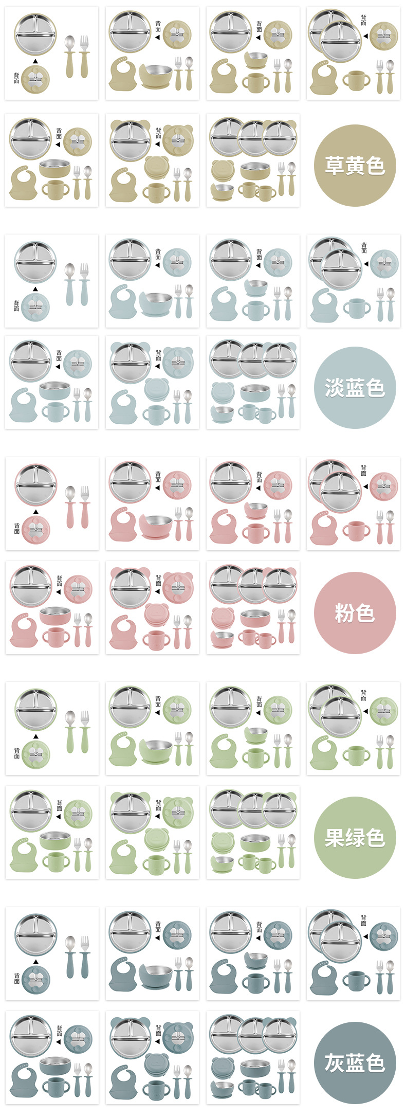 [grass yellow] stainless steel plate 20cm + stainless steel fork spoon (curved handle) + stainless steel bowl + cup + bib