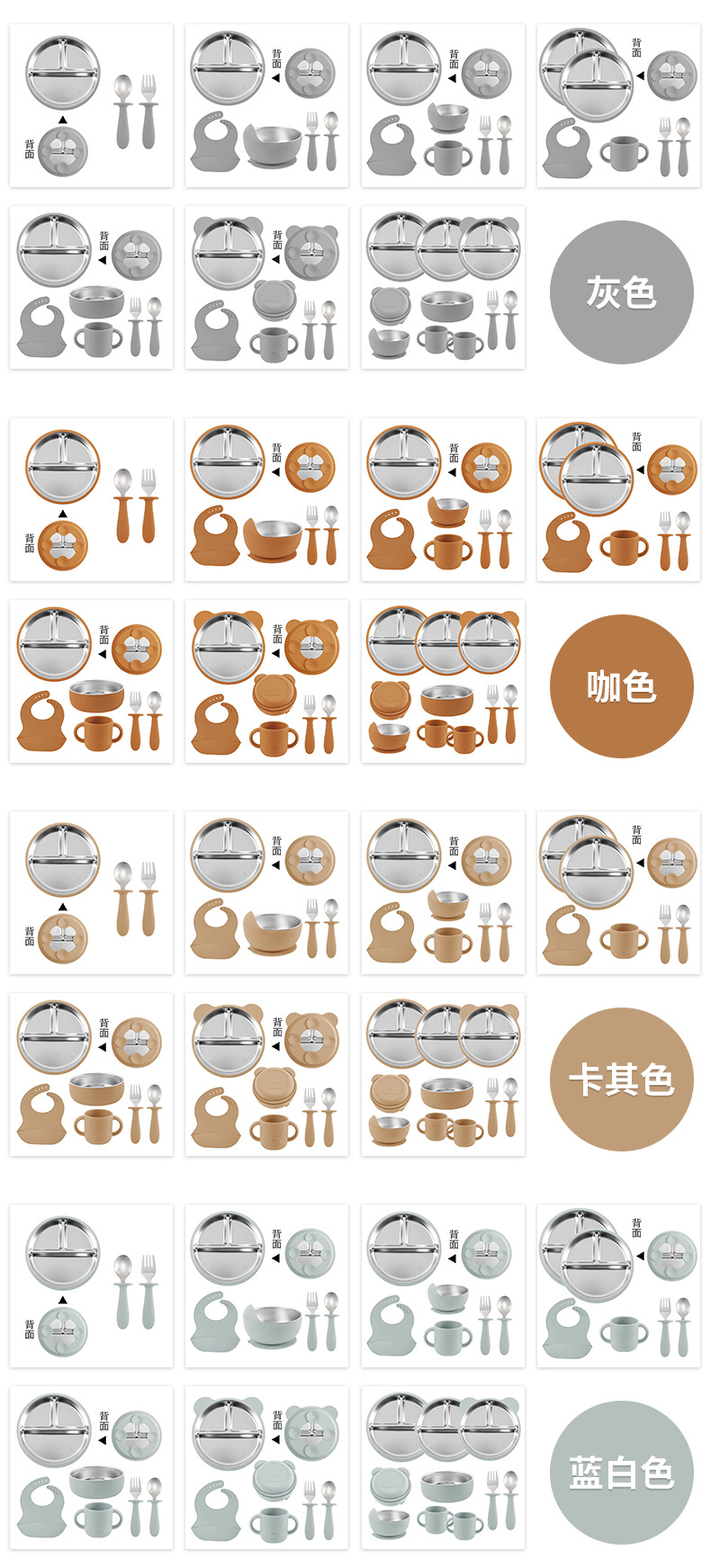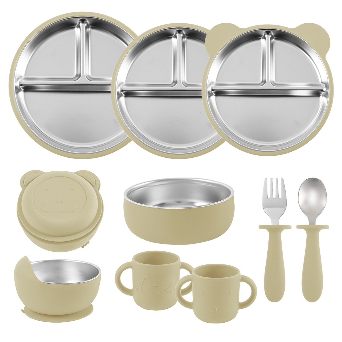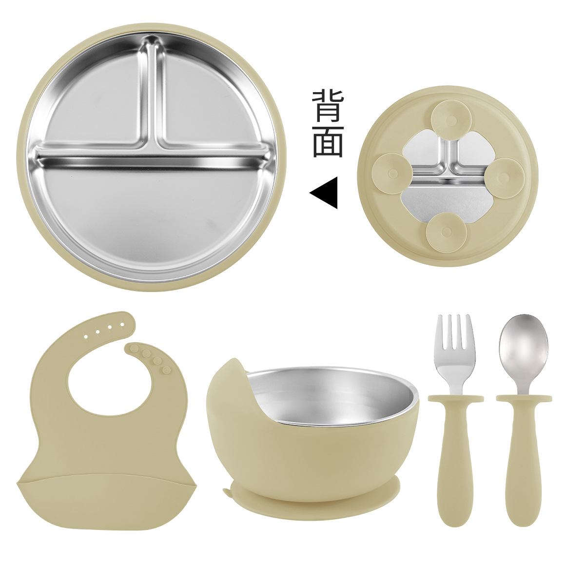 [khaki] stainless steel plate 20cm + stainless steel fork spoon (curved handle) + snail bowl + cup + bib