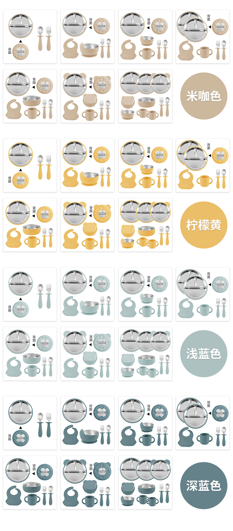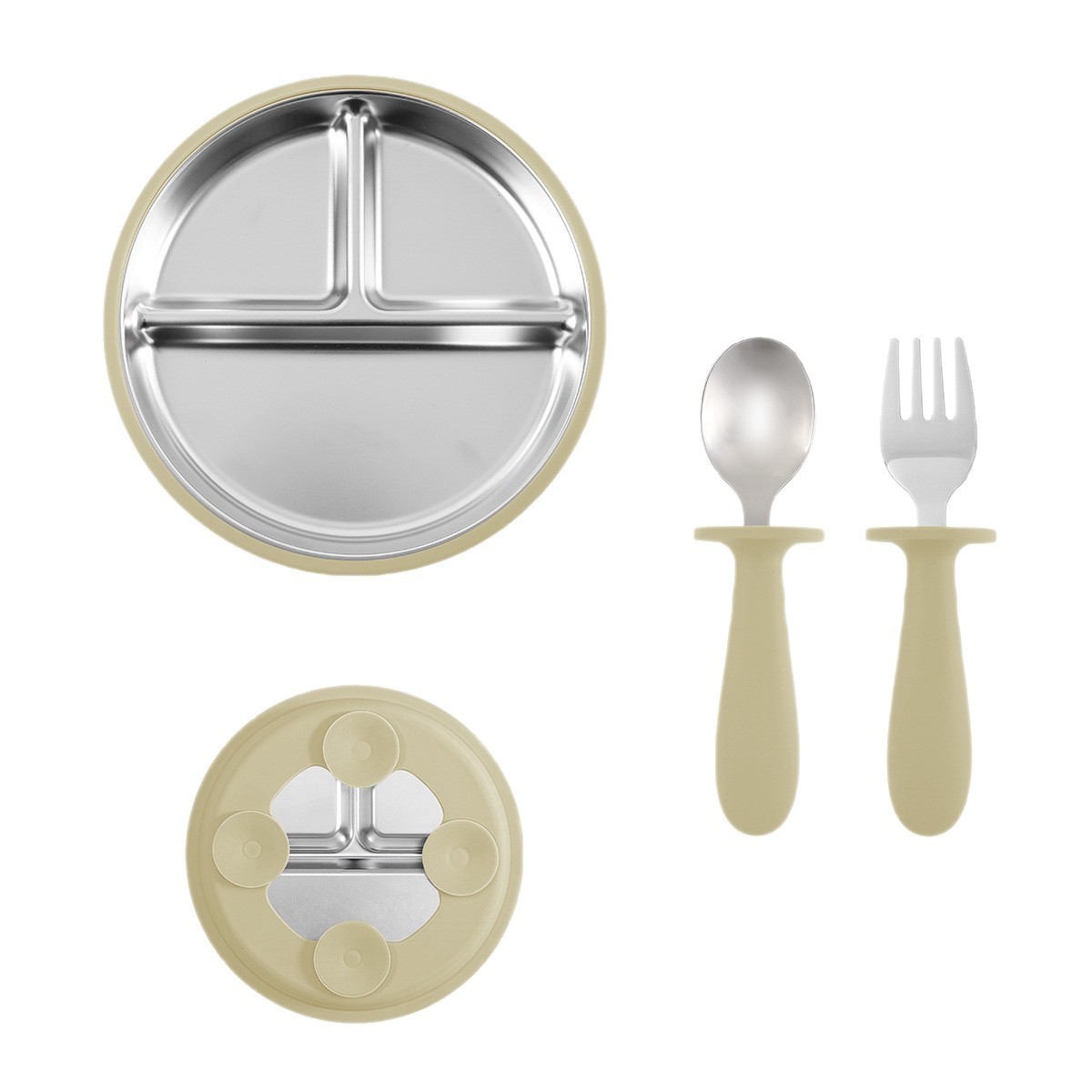 [khaki] stainless steel plate 20cm + stainless steel fork spoon (curved handle) + stainless steel plate 23cm + cup + bib