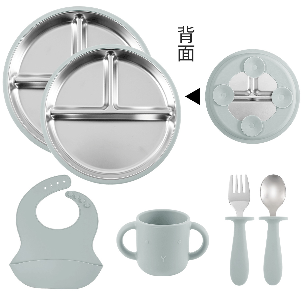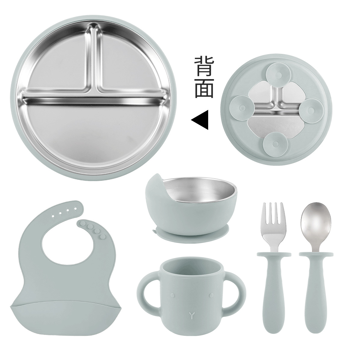 [grass yellow] 20cm stainless steel plate + stainless steel fork spoon (curved handle) + snail bowl + cup + bib