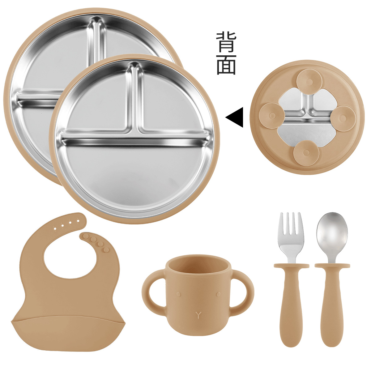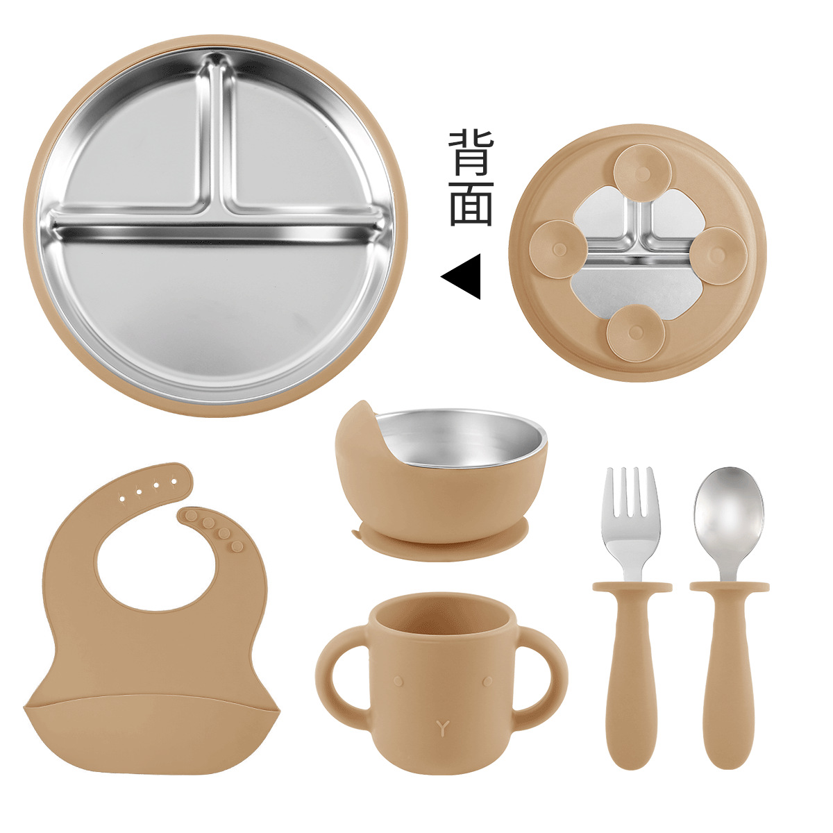 [khaki] stainless steel plate 20cm + stainless steel fork spoon (curved handle) + stainless steel bowl + cup + bib