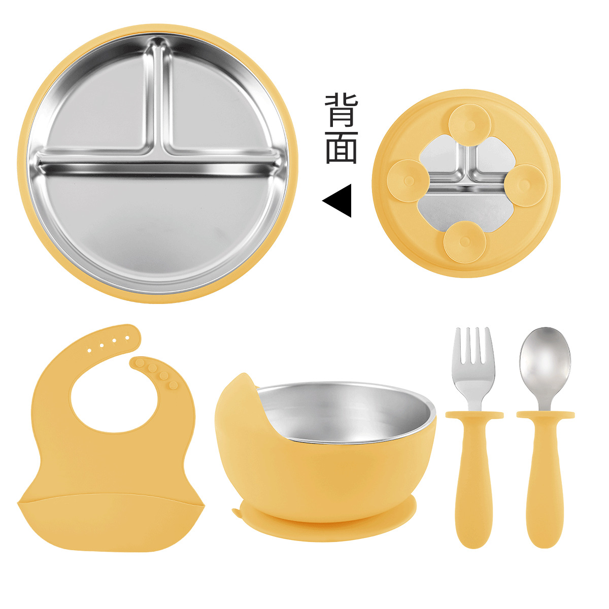 [lemon yellow] stainless steel plate 20cm + stainless steel fork spoon (curved handle) + stainless steel plate 23cm + cup + bib