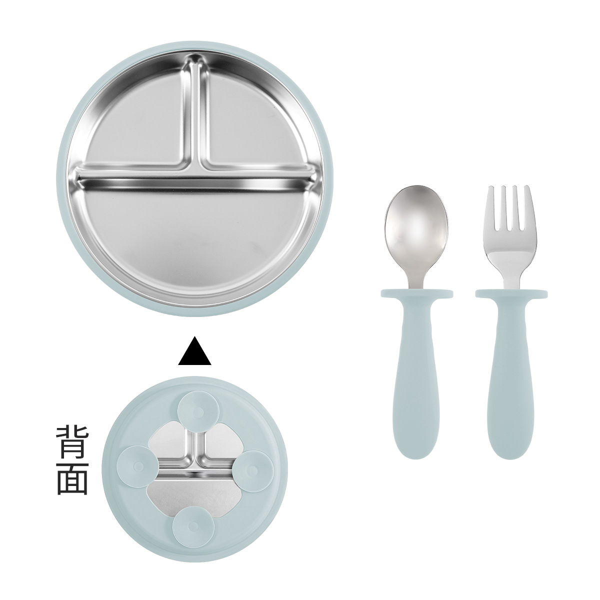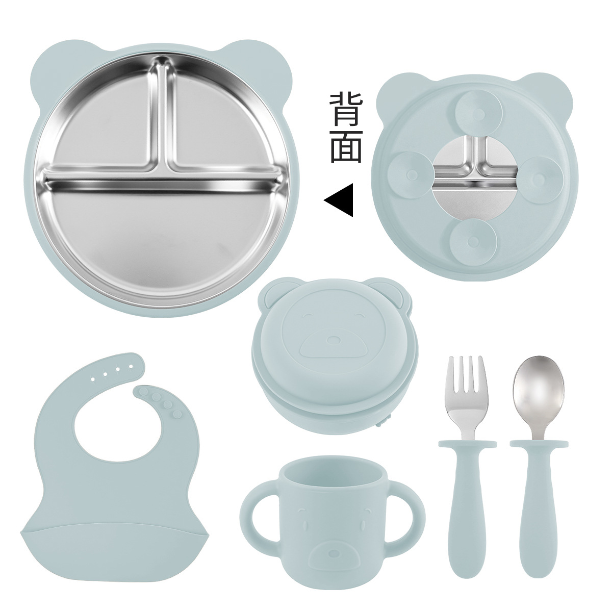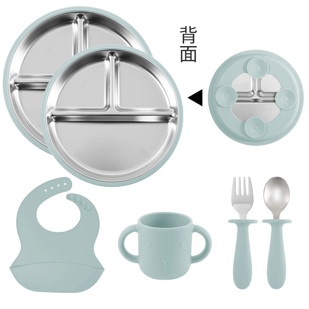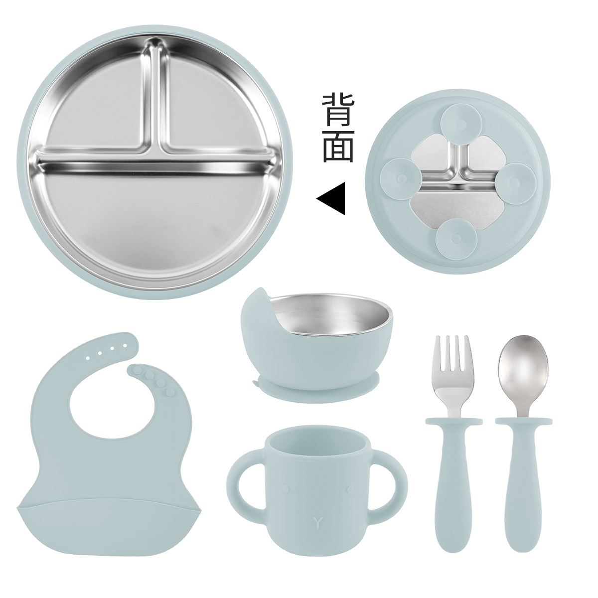 [light blue] stainless steel plate 20cm + stainless steel fork spoon (curved handle) + stainless steel plate 23cm + cup + bib