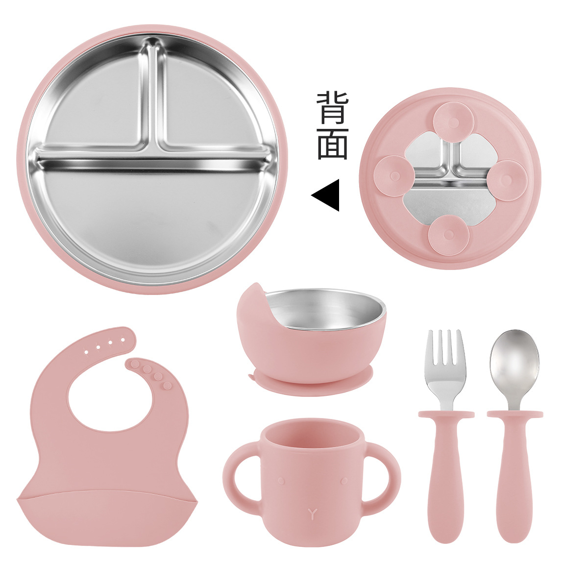 [pink] stainless steel plate 20cm + stainless steel fork spoon (curved handle) + stainless steel bowl + cup + bib