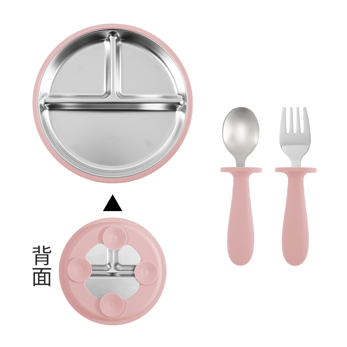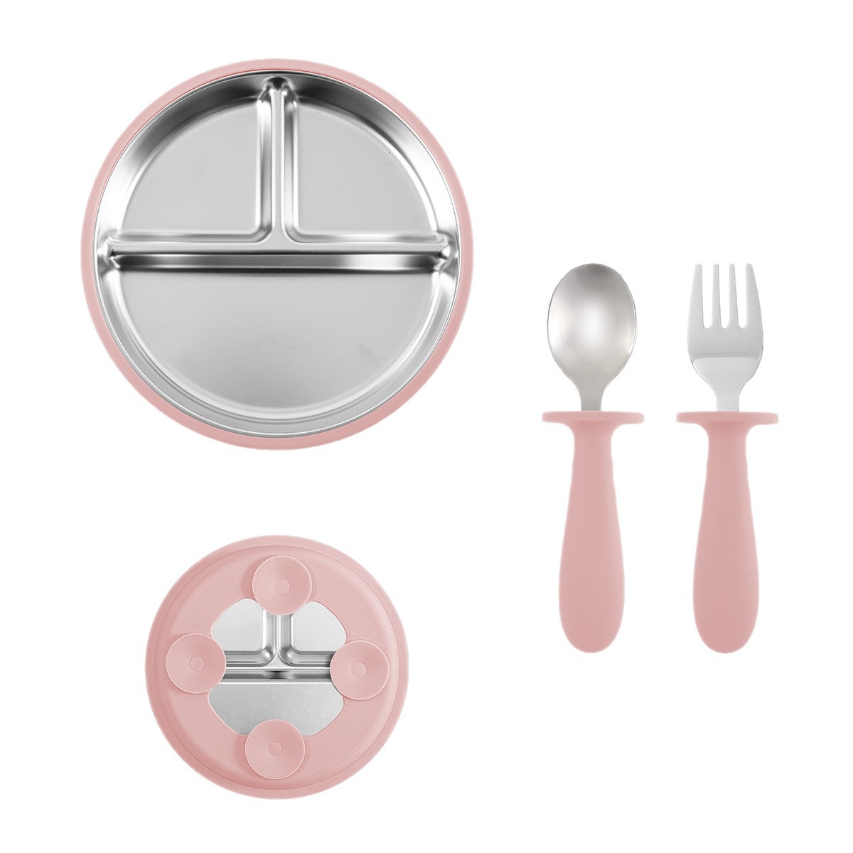 [pink] stainless steel plate 20cm + stainless steel fork spoon (curved handle) + stainless steel plate 23cm + cup + bib