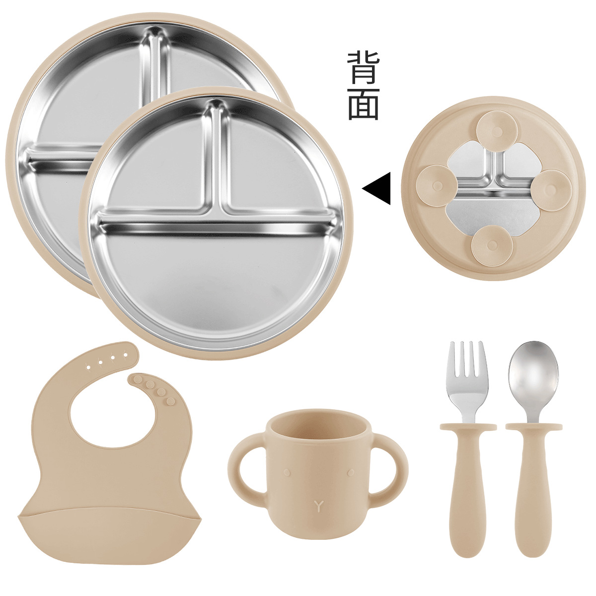 [cream and coffee-colored] stainless steel plate 20cm + stainless steel fork spoon (curved handle) + stainless steel plate 23cm + cup + bib
