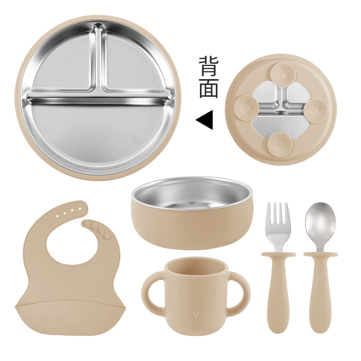 [cream and coffee-colored] stainless steel plate 20cm + stainless steel fork spoon (curved handle) + snail bowl + cup + bib