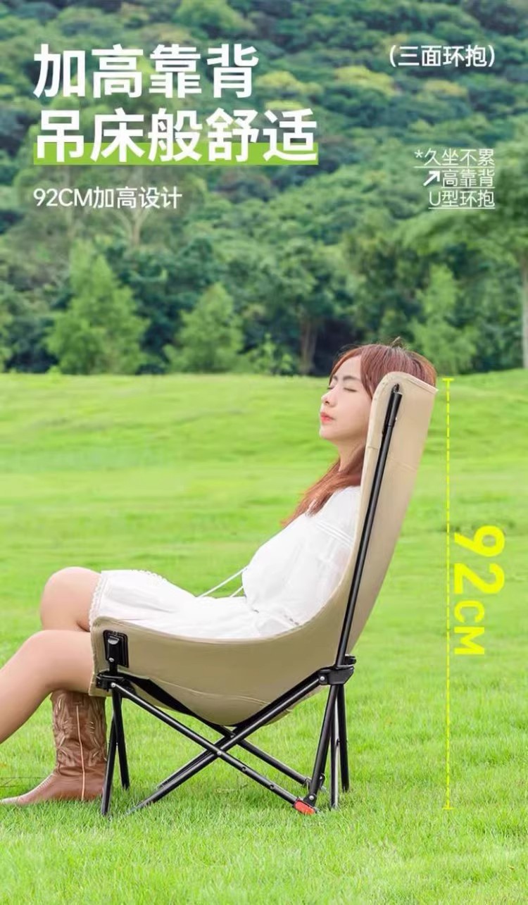 Three-level adjustable moon chair with leg supports and headrest, suitable for outdoor camping, napping, and portable folding reclining chair.