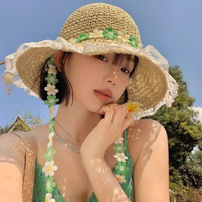 six-flap lace straw hat-khaki