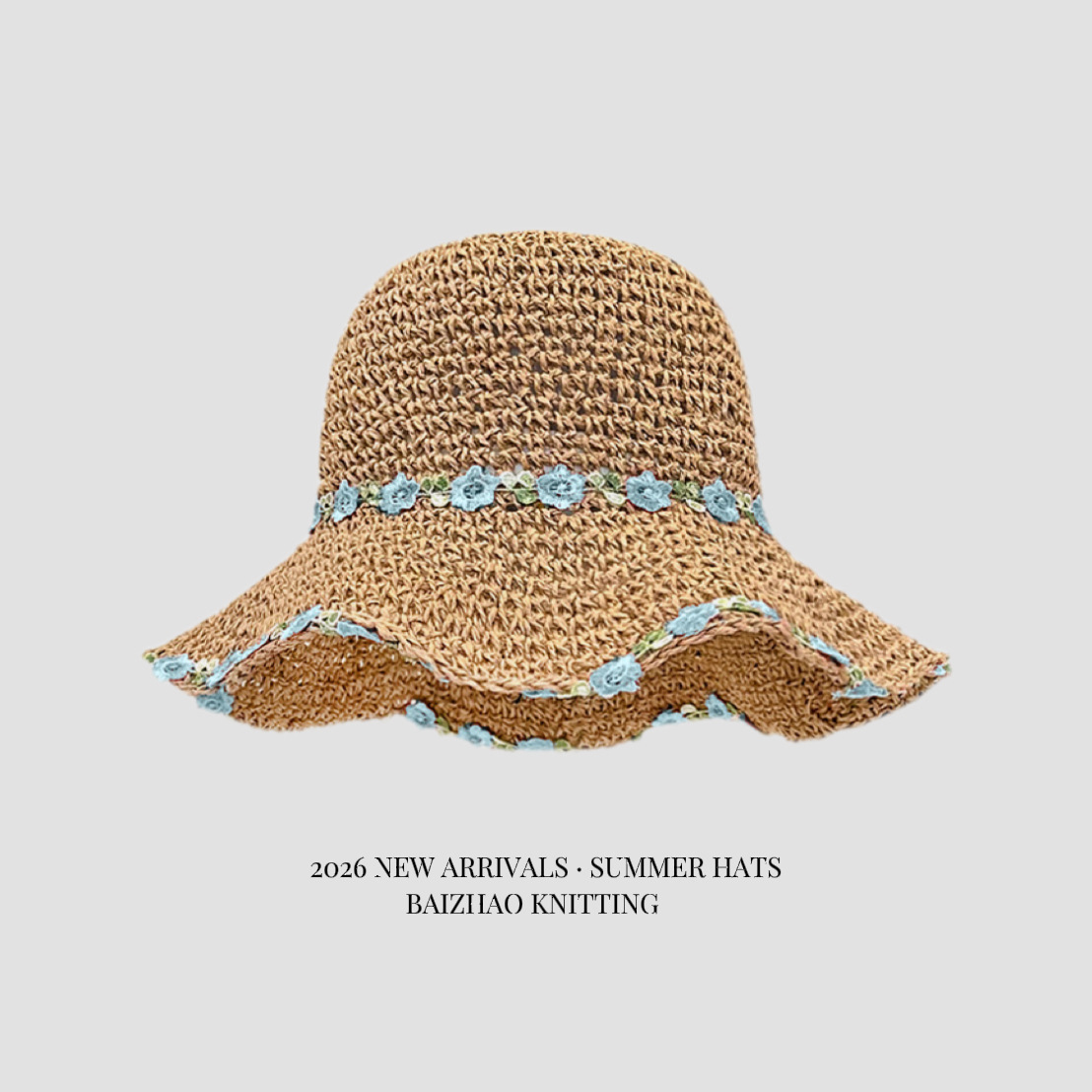 floral straw hat-khaki blue flower