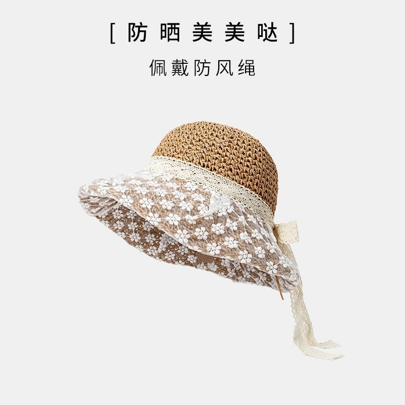 six-flap lace straw hat-beige
