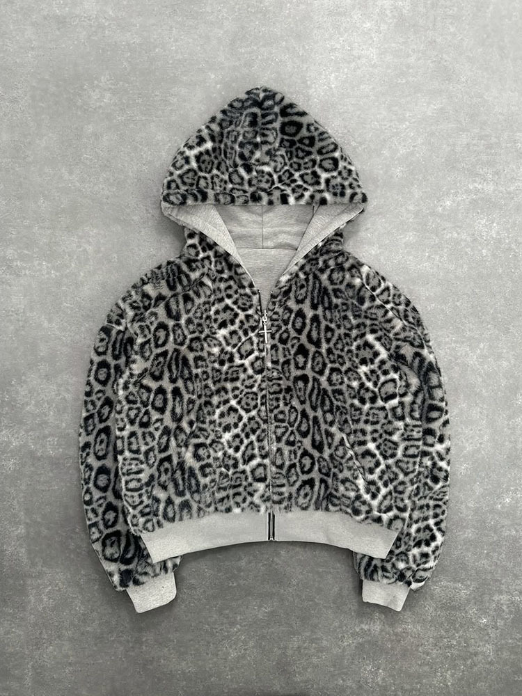 2025 european and american new autumn/winter new hoodie two-sided wearable vintage leopard print zip-up hoodie loose top