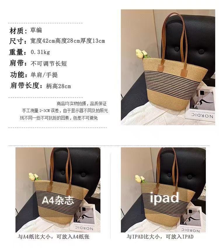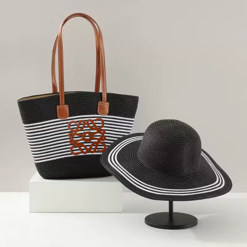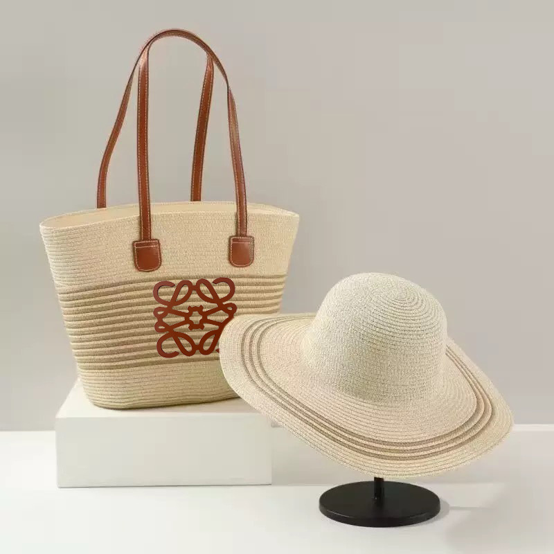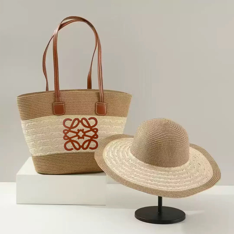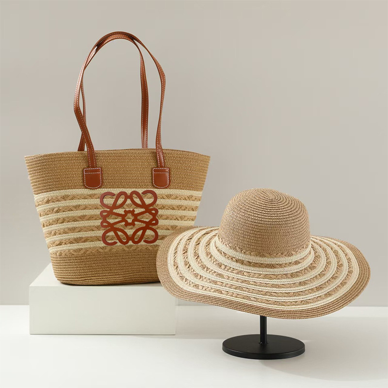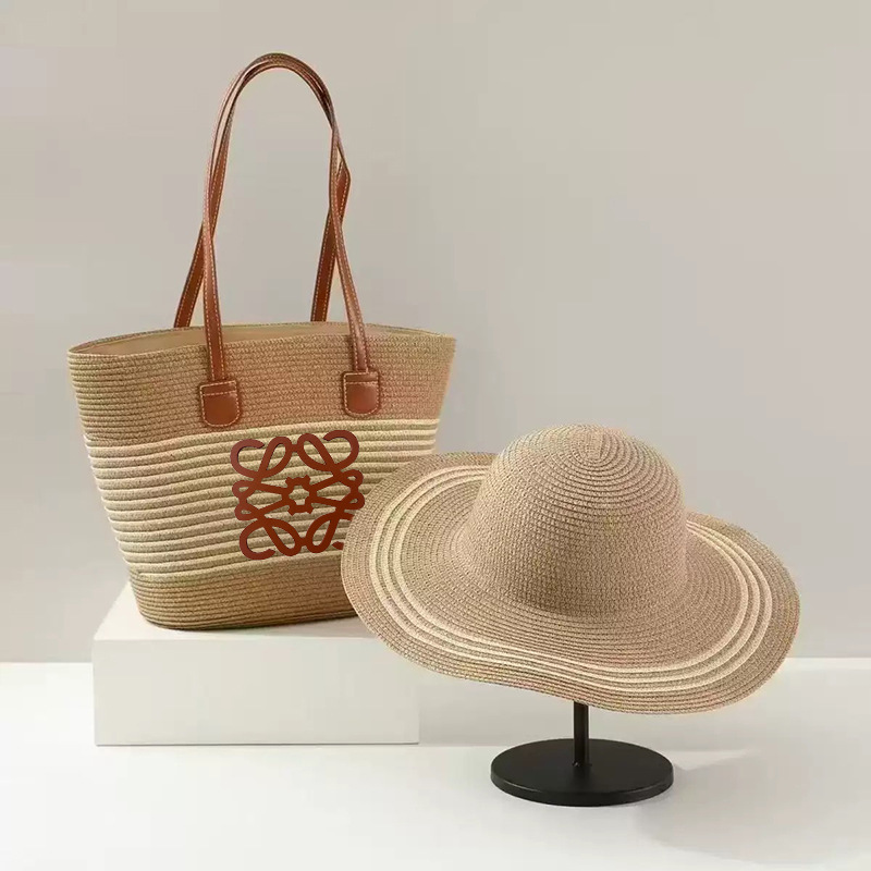 popular foreign trade straw hat striped straw bag two-piece travel sun hat big brim large capacity totes suit