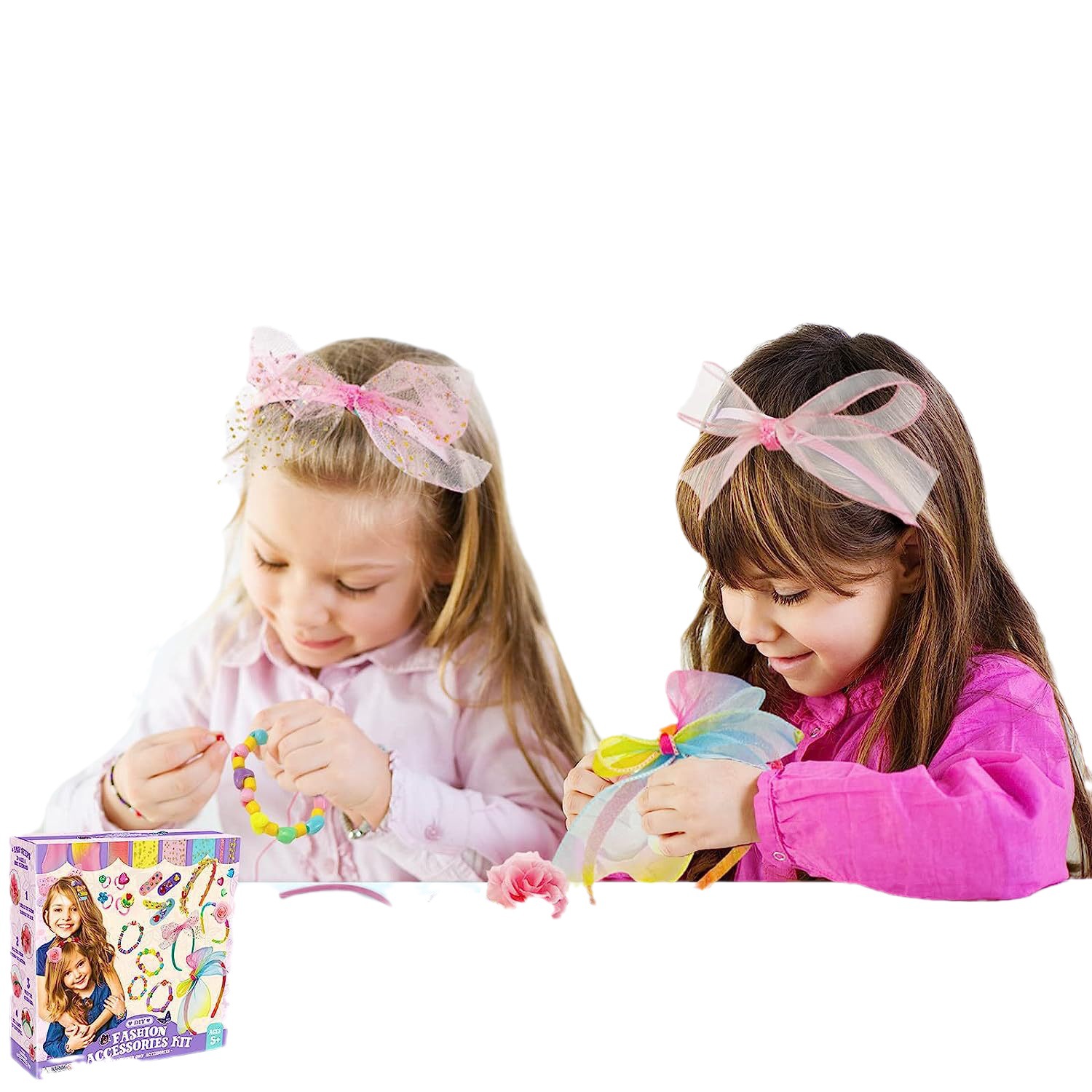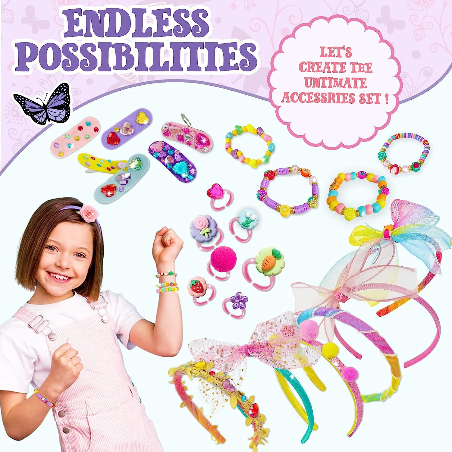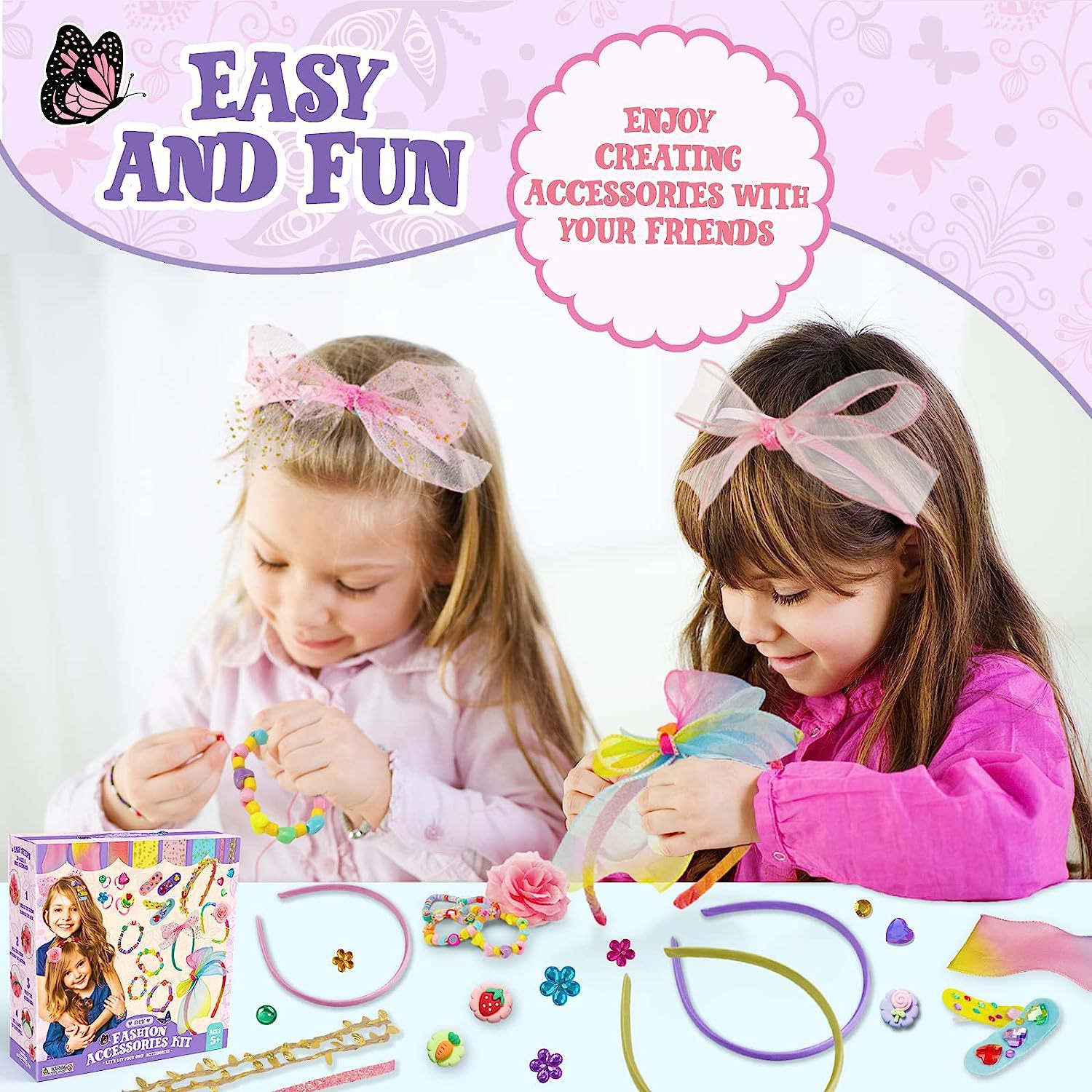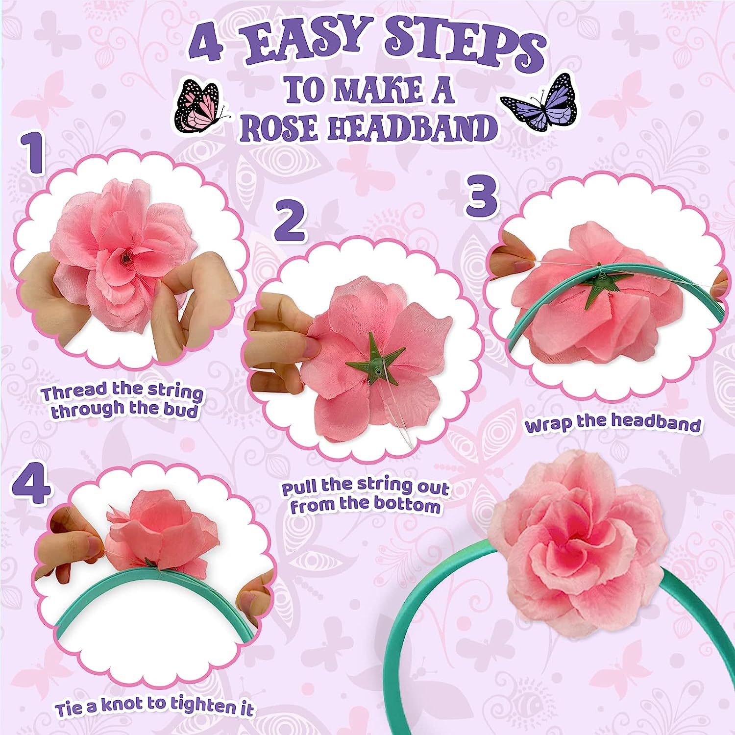 Everything you need is included - The kit includes everything you need to start, including headbands, hair clips, bracelets, rings, roses, fruit beads, sticker sets, stars, sequins, olive leaf ribbons, fishing line, and glue to attach everything to the headband.