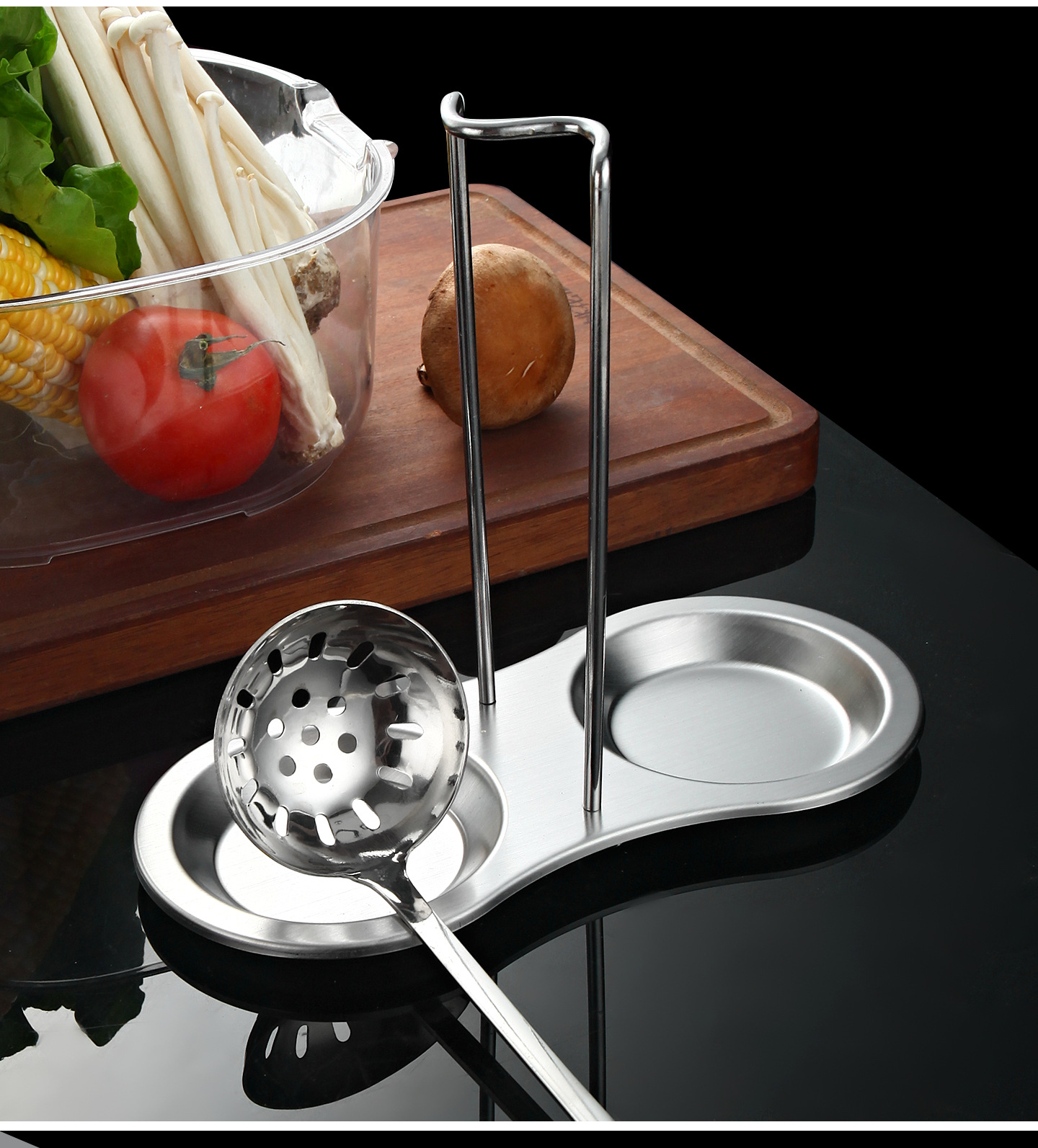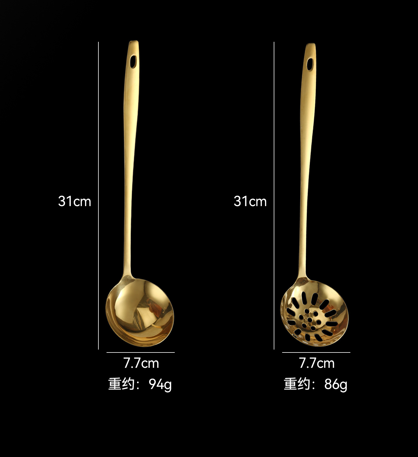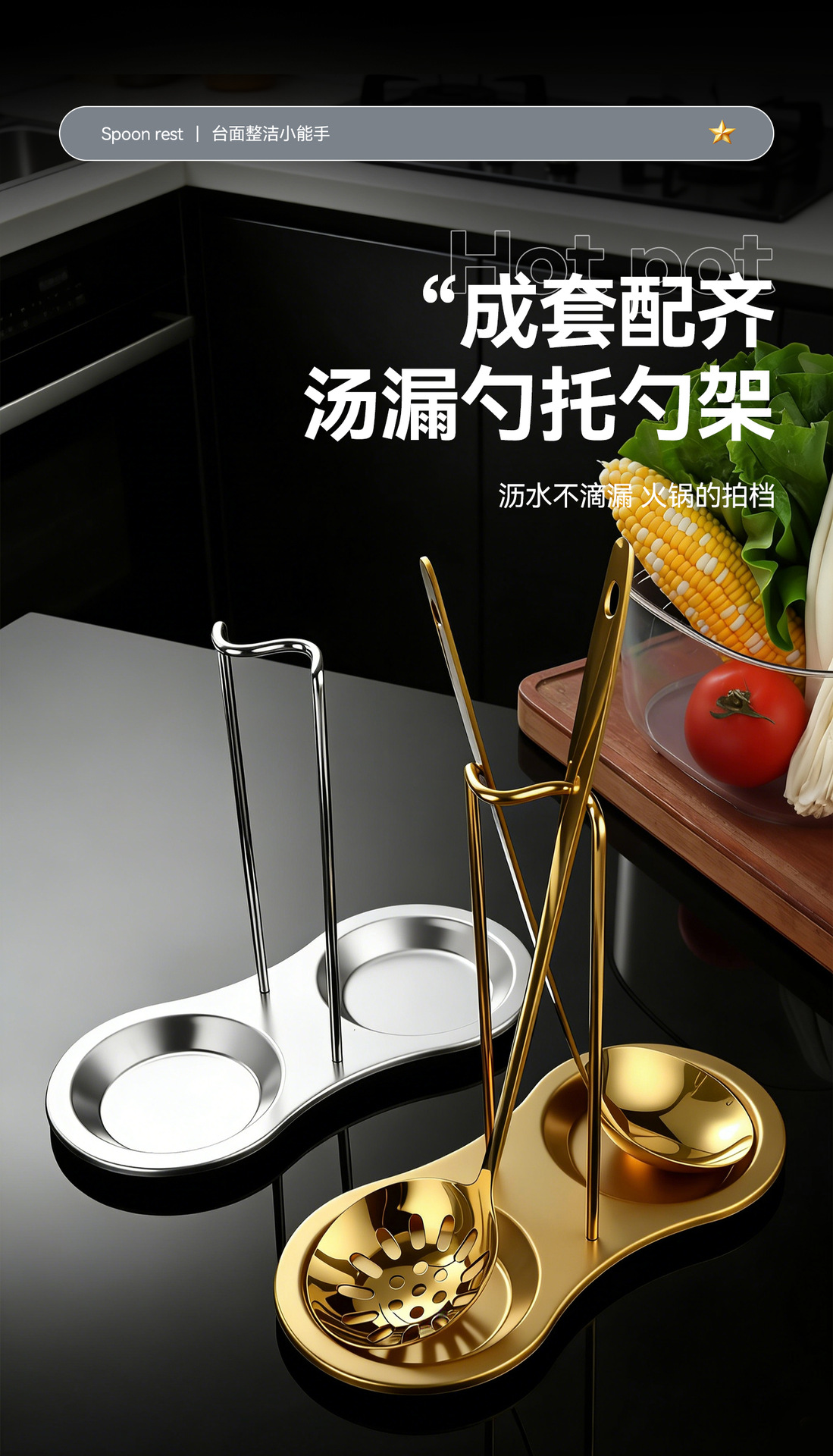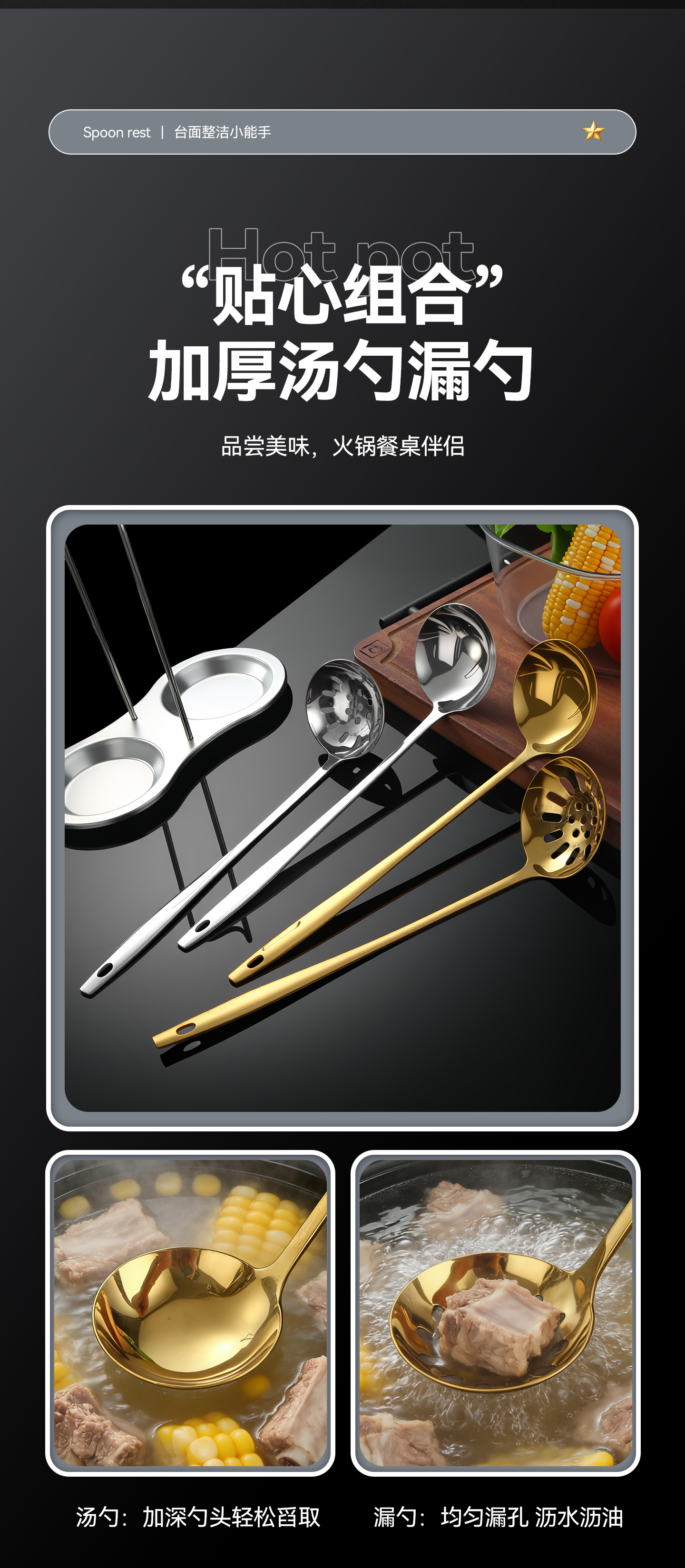 golden-spoon holder + soup spoon + colander