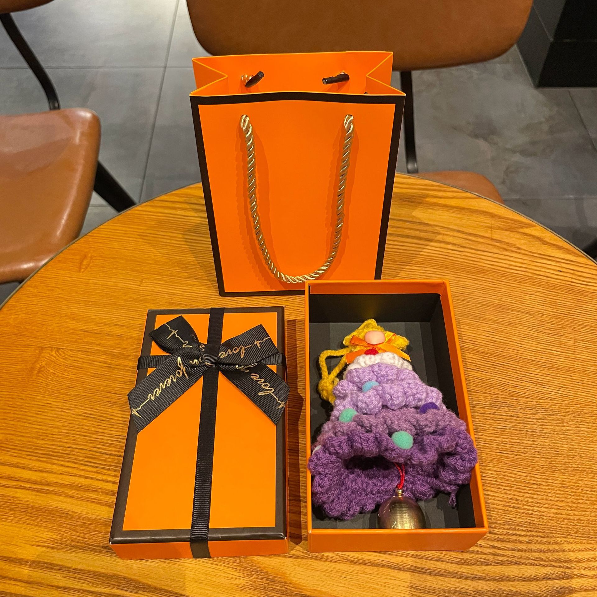 wool woven colorful christmas tree bell pendant d + orange gift box + gift bag