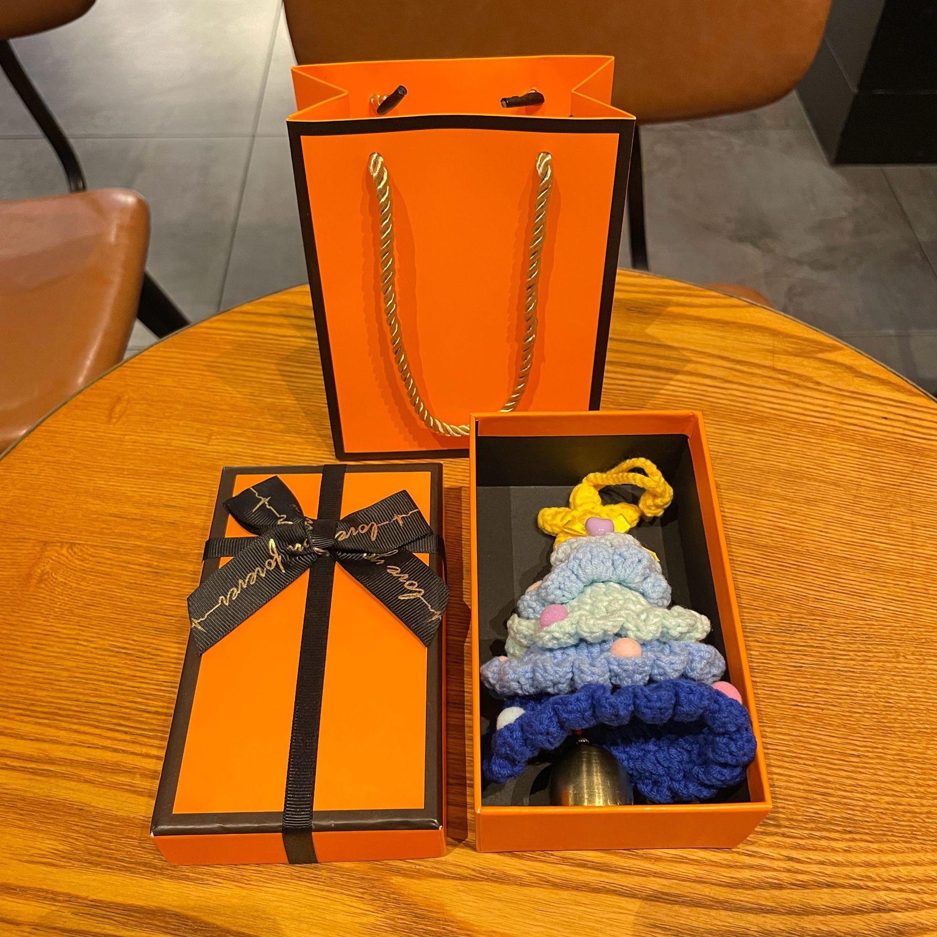 wool woven colorful christmas tree bell pendant a + orange gift box + gift bag