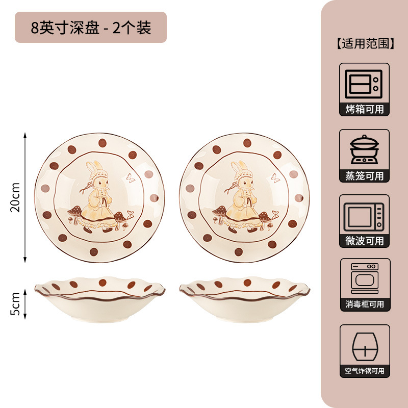 8-inch lotus-edge deep plates-milky white glaze hepburn rabbit-set of 2