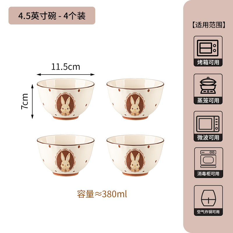 4.5-inch fluted rim bowl – milky white glaze, hepburn rabbit design – set of 4