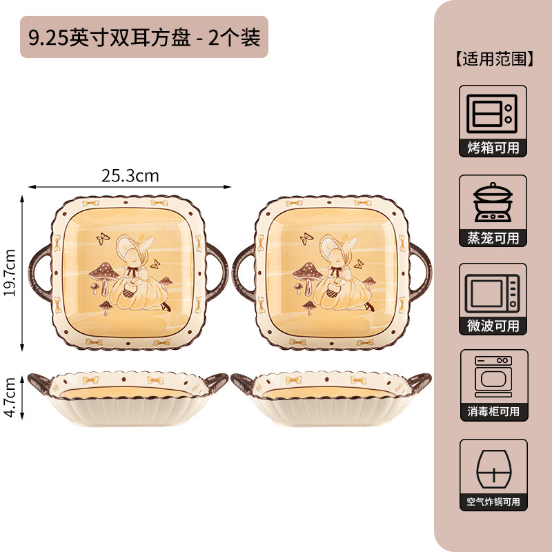 9.25-inch lotus-themed double-handle square plate-milky white glaze hepburn rabbit