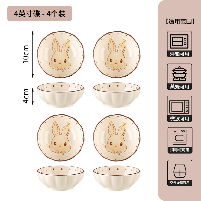 4-inch lotus petal plate – milky white glaze, hepburn rabbit design – set of 4