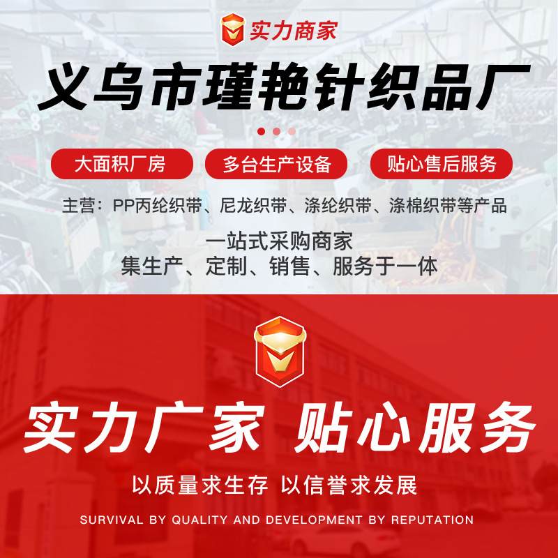 本The company specializes in the production of various 150D-1200D PP propylene yarn belts, nylon belts, cotton belts, polyester belts, and various jacquard belts. We welcome new and old customers to call or send samples.
