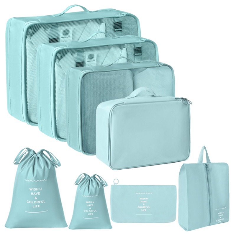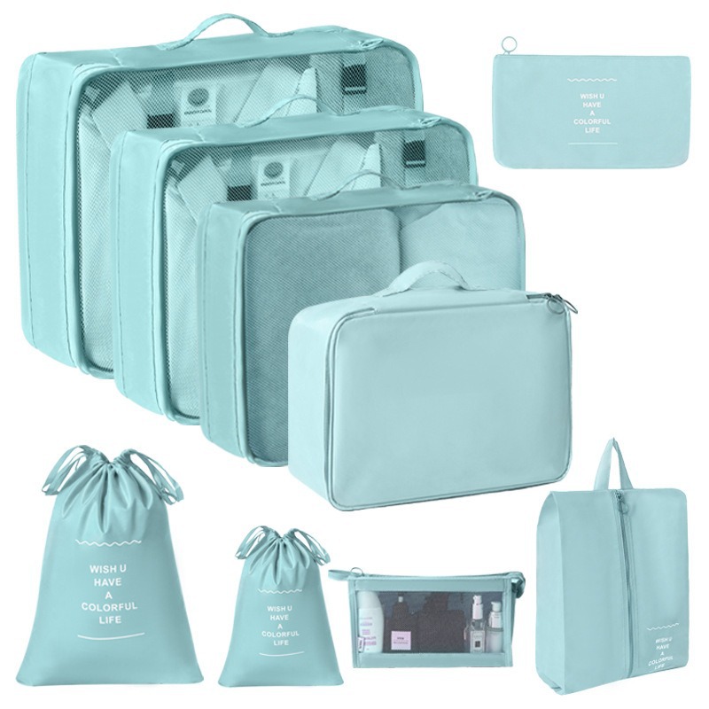 korean blue travel buggy bag nine-piece set [double drawstring bag + cosmetic bag]]