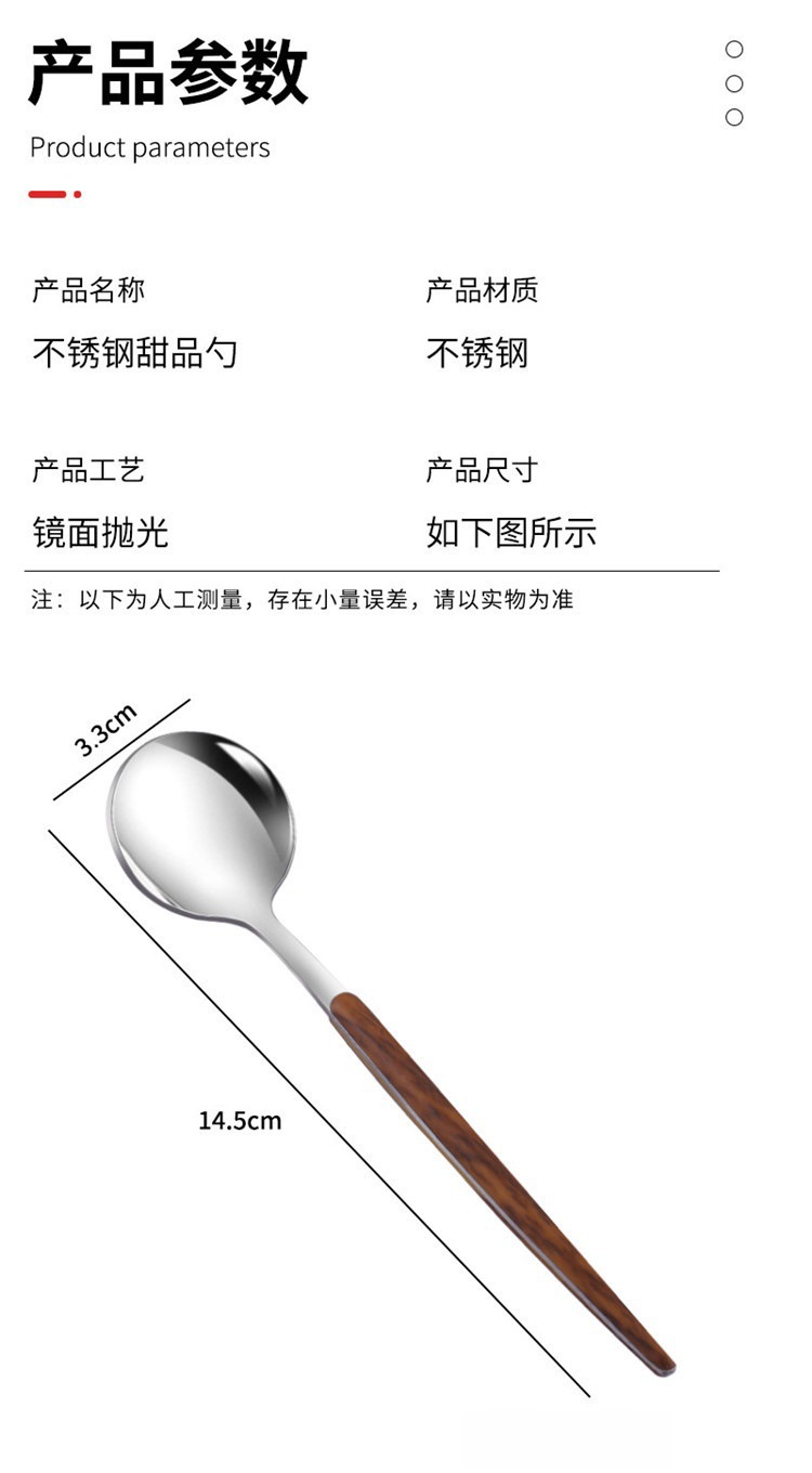 specifications: stainless steel wood grain clamp handle dessert spoon